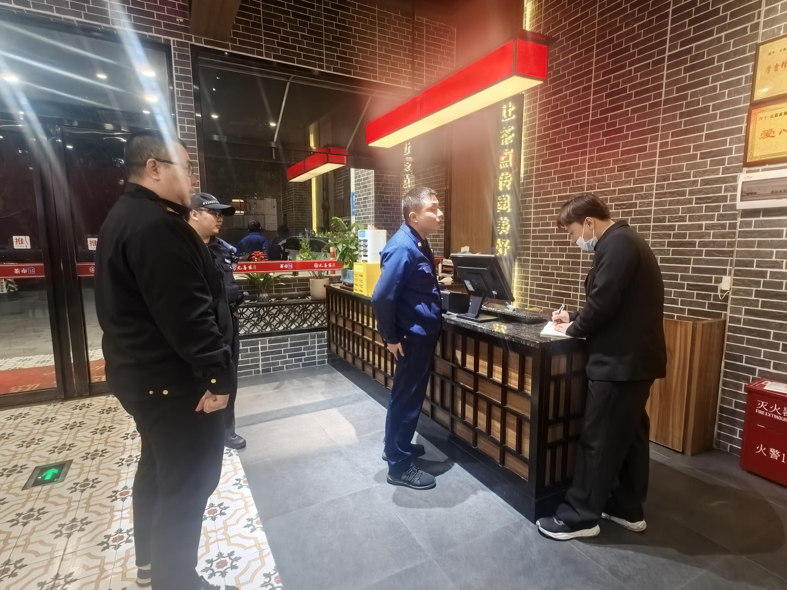 12月20日晚,市場管理股工作人員配合縣消防救援大隊在羅陽街道開展酒吧、臺球室、餐飲店等場所消防安全“夜查”工作。