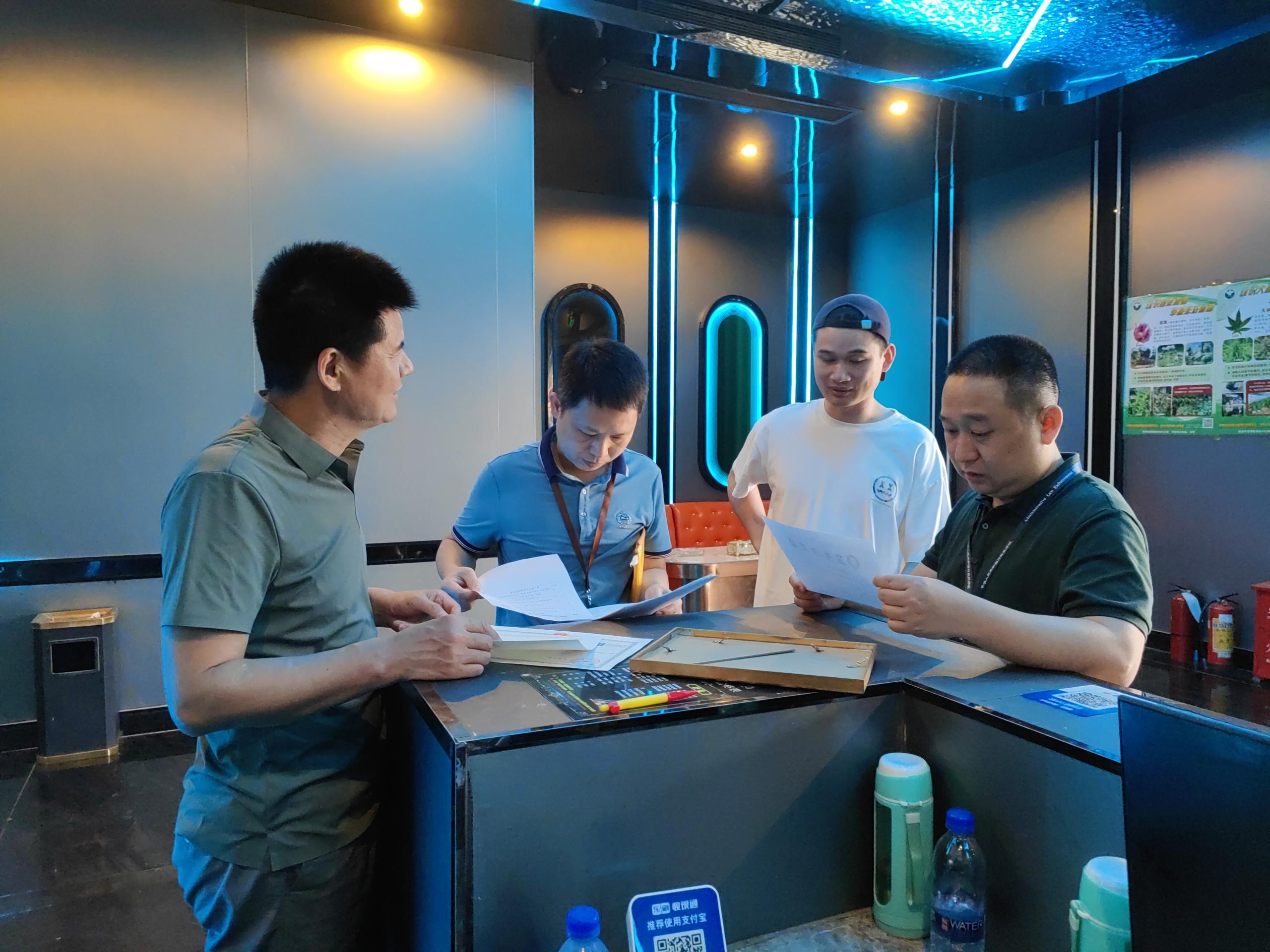 4月23日,局黨組成員、副局長謝文山帶領市場管理股工作人員前往園洲鎮,對4家KTV場所申請延續進行場地審核。