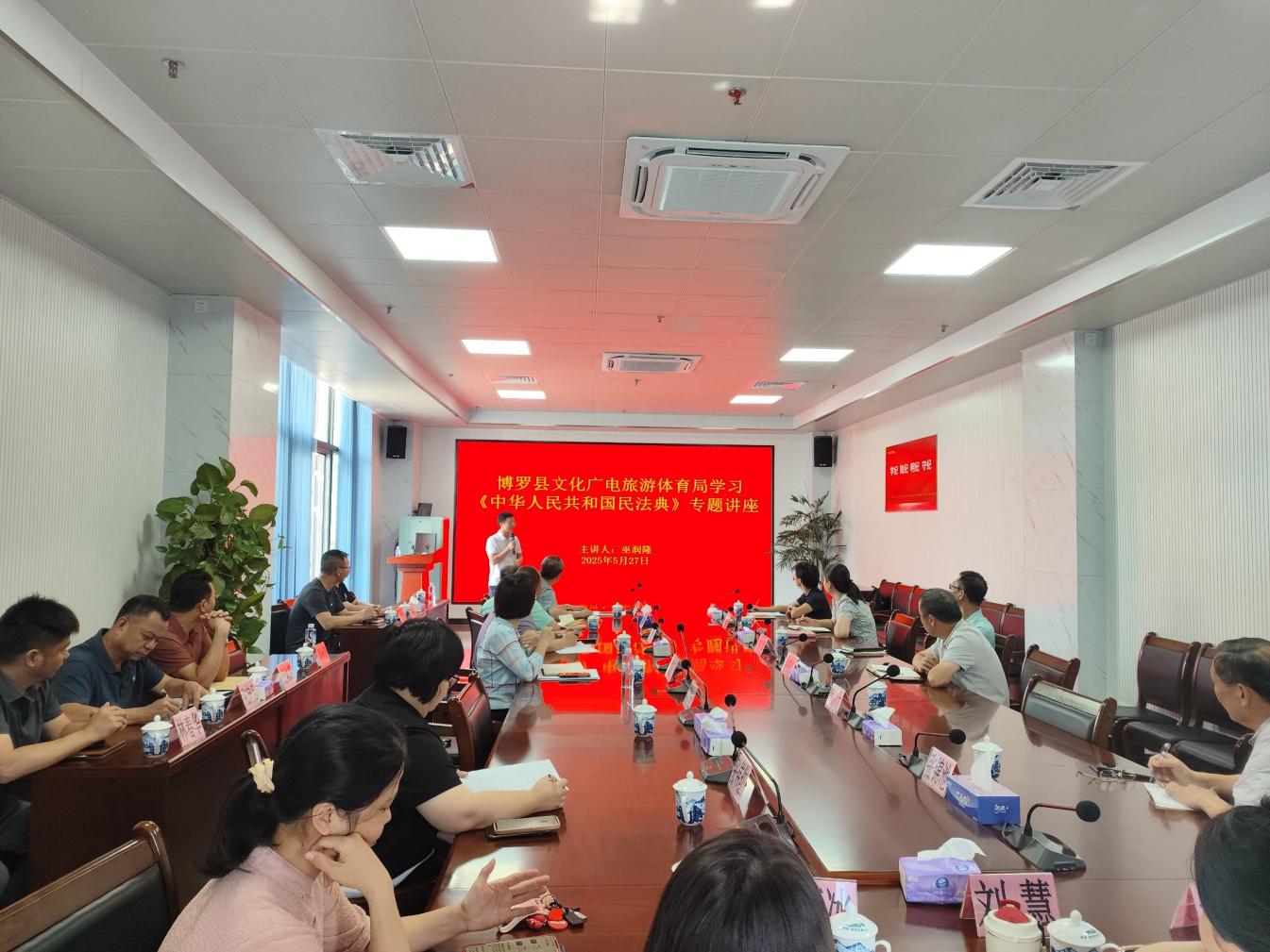 2025年5月是第五個“民法典宣傳月”,為深入學習貫徹習近平法治思想,進一步推動民法典學習宣傳走深走實,5月27日,縣文化廣電旅游體育局舉辦了《中華人民共和國民法典》專題講座,專門邀請了廣東惠泰律師事務所的巫潤隆律師進行授課。縣文化廣電旅游體育局黨組書記、局長陳雪花主持,局黨組成員、班子成員及中層以上干部參加學習。