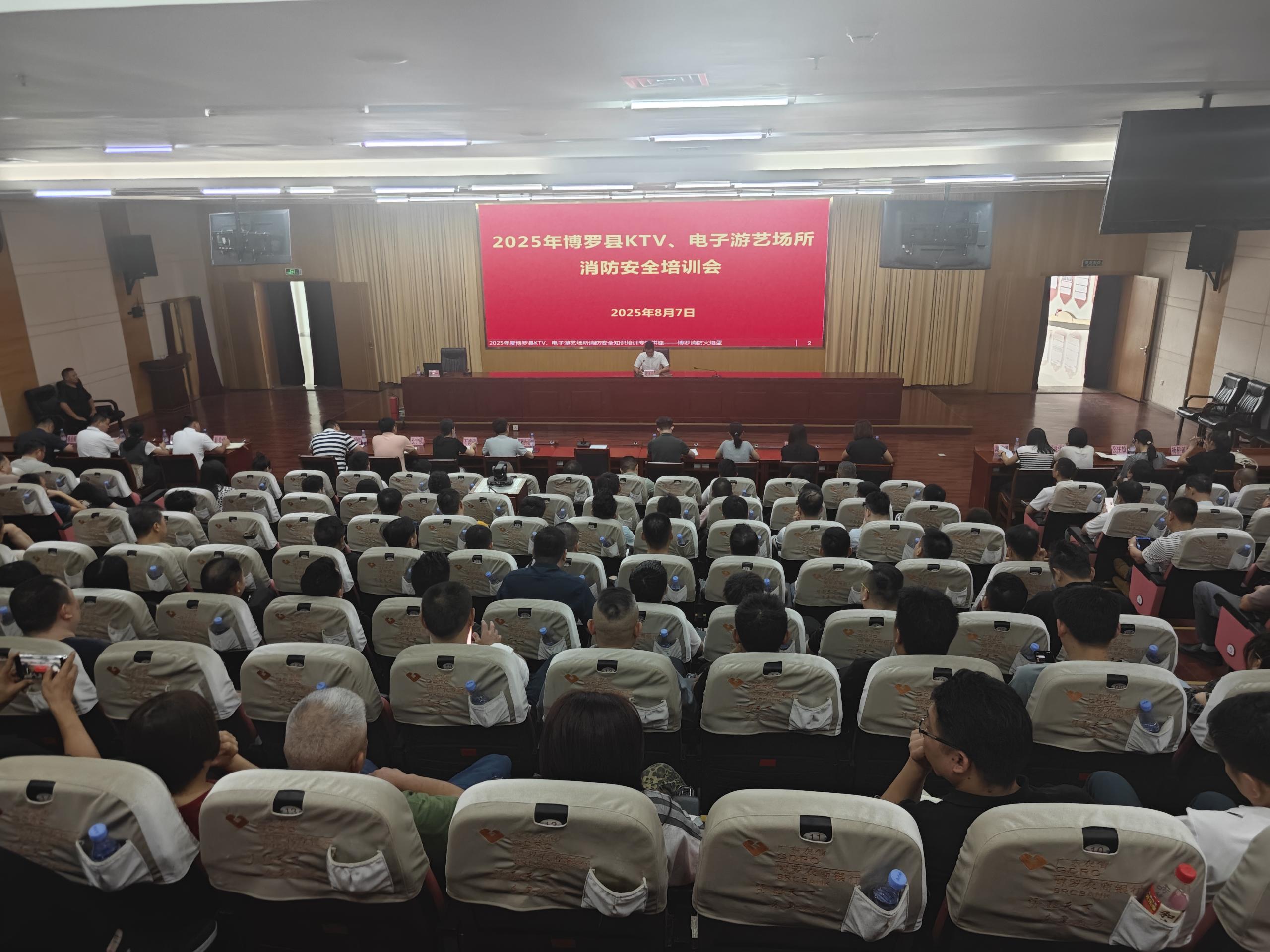 8月7日下午,2025年博羅縣KTV、電子游藝場所消防安全培訓會在博羅縣文化中心召開。各鎮(街道)分管領導和相關工作人員,局各股室(隊)、下屬事業單位相關工作人員,以及全縣KTV、電子游藝場所消防安全責任人共約170人參加了培訓會。會議由局黨組成員、副局長謝文山主持。
