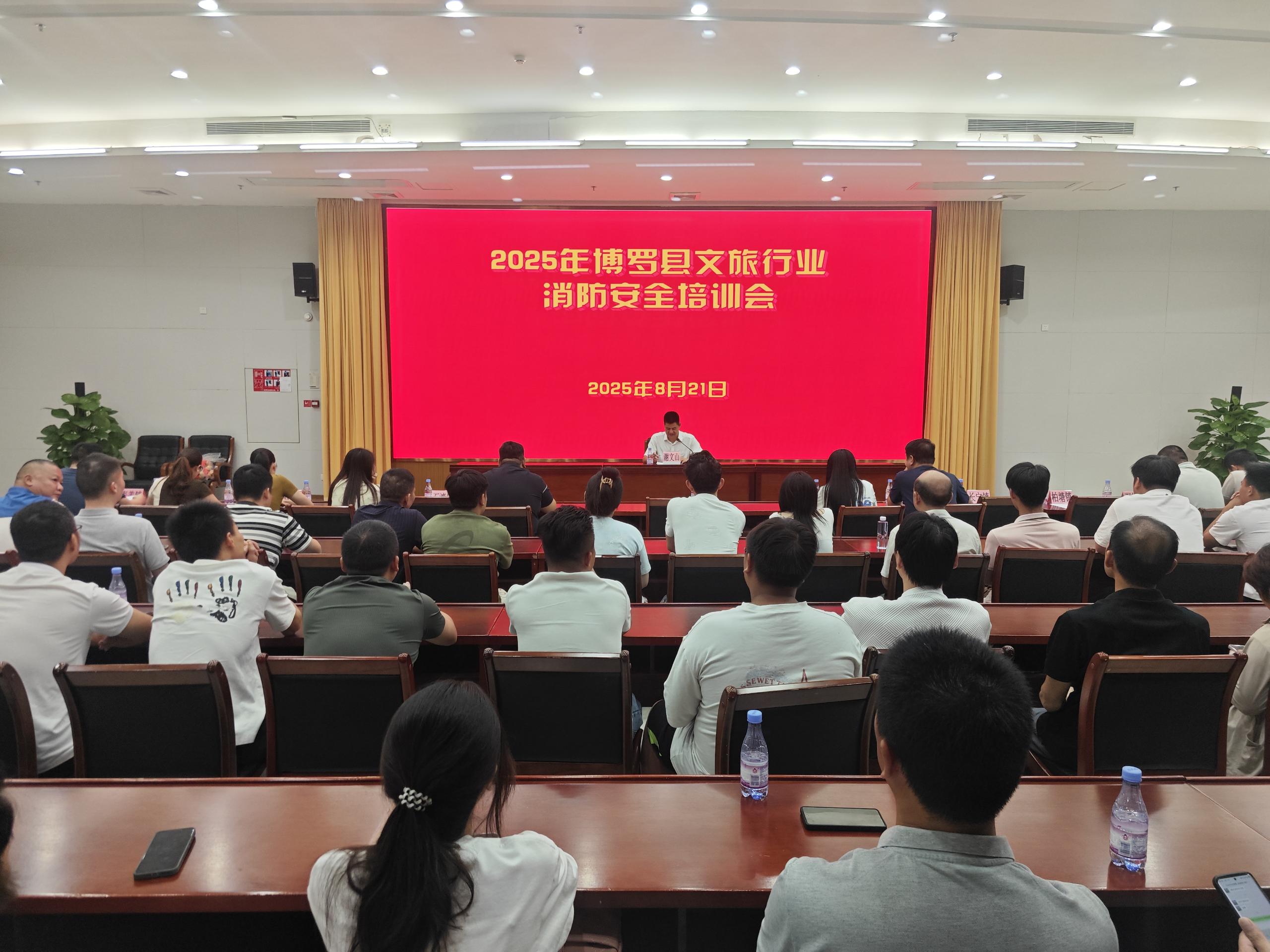 8月21日上午,2025年博羅縣文旅行業(yè)消防安全培訓(xùn)會在博羅縣文化中心召開。各鎮(zhèn)(街道)相關(guān)工作人員,局各股室(隊(duì))、下屬事業(yè)單位相關(guān)工作人員,以及全縣網(wǎng)吧、劇本娛樂場所、星級飯店、納入登記民宿、A級景區(qū)、旅行社消防安全責(zé)任人共約120余人參加了培訓(xùn)會。會議由局黨組成員、副局長謝文山主持。
