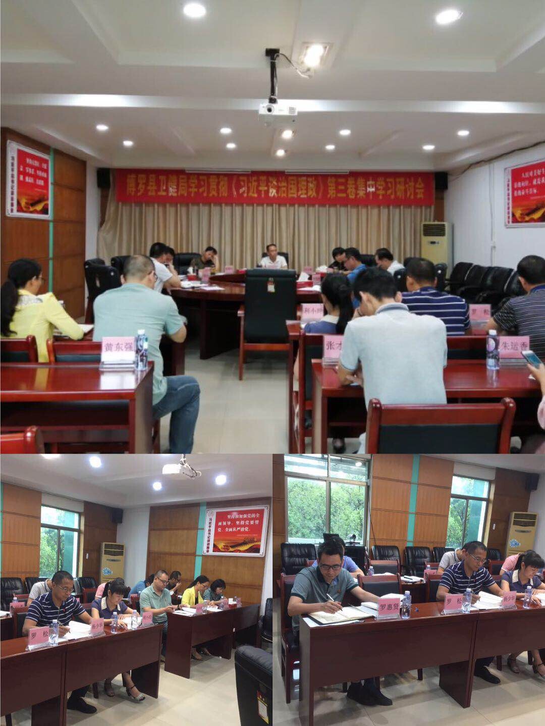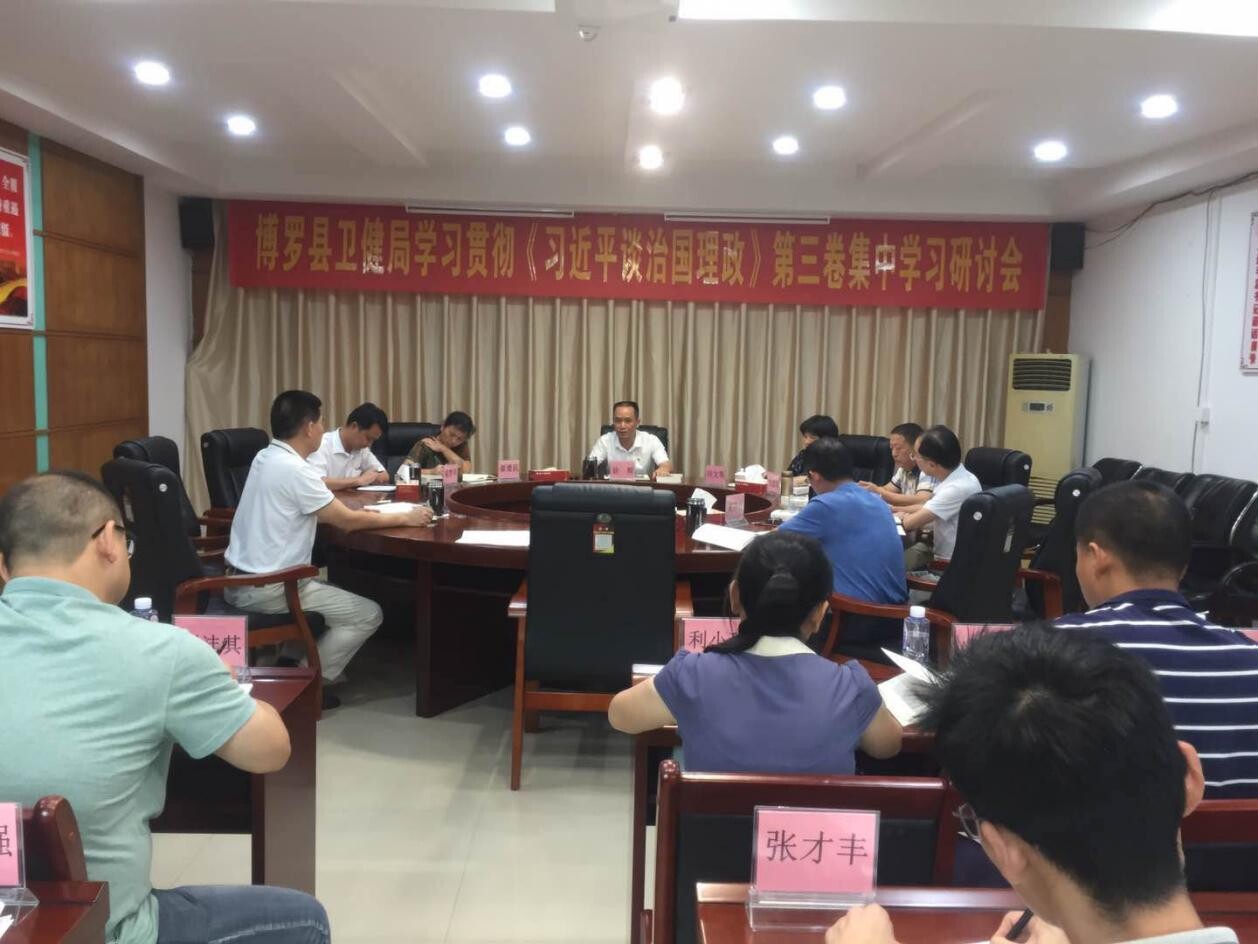 9月11日下午,博羅縣衛生健康局黨組集中學習貫徹《習近平談治國理政》第三卷研討會。會上,局黨組各成員及相關股室負責人就通過學習《習近平談治國理政》第三卷,如何結合自身實際,做到胸懷理想、腳踏實地、奮發有為地推進各項衛生健康工作進行研討。