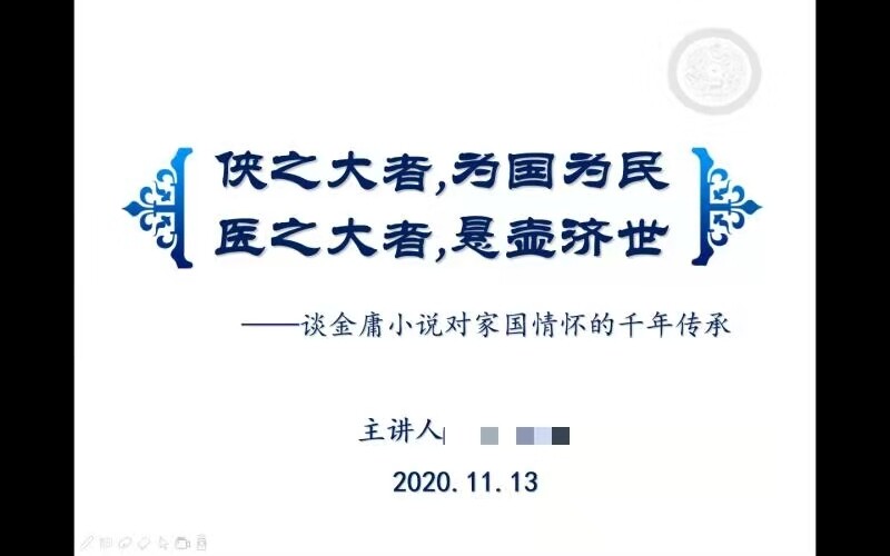 主講者以金庸小說為切入點,從宋朝講到2020年,跨越千年的歷史時空;從真實的歷史到虛構的江湖,再到我們親身經歷的當下;從金戈鐵馬,殺敵報國到仁心仁術,懸壺濟世;從抗金名將岳飛到射雕大俠郭靖;從共和國勛章獲得者鐘南山到00后護士劉家怡。這是一場穿越千年的文化大餐。