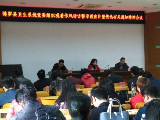 2018年12月29日上午,博羅縣衛生系統在縣衛計局組織觀看2018年度省紀委作風暗訪警示教育片《打通正風反腐“最后一公里”》及傳達學習中紀委《關于貫徹落實習近平總書記重要講話精神嚴肅整治領導干部利用名貴特產類特殊資源謀取私利問題的通知》精神。局班子成員、股室負責人和縣直醫療衛生單位中層以上干部共110多人參加了會議。會議由局黨組成員張武同志主持。