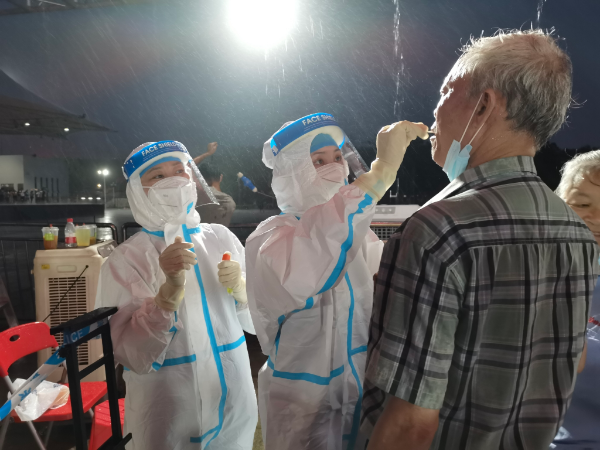 危難面前見(jiàn)忠誠(chéng),挑戰(zhàn)面前顯擔(dān)當(dāng)。在園洲鎮(zhèn)采樣現(xiàn)場(chǎng),酷熱難耐,氣溫高達(dá)30多度,不到半小時(shí),汗水就濕透了隊(duì)員們的內(nèi)衣,但采樣醫(yī)護(hù)人員仍然保持干勁、高效運(yùn)轉(zhuǎn)……盡管在隔離衣下的她們汗如雨下,但無(wú)一人喊苦喊累,不分晝夜,堅(jiān)守在采樣點(diǎn),踐行著醫(yī)護(hù)人員的初心使命,無(wú)愧于“白衣天使”這一稱號(hào)。