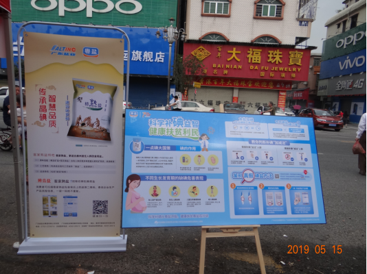 此次宣傳活動內容豐富、形式多樣、利用展板、橫幅等宣傳方式進行宣傳,發放碘缺乏宣傳單1000多份,預防碘缺乏宣傳手袋210多個,免費測量血糖、血壓300多人次。