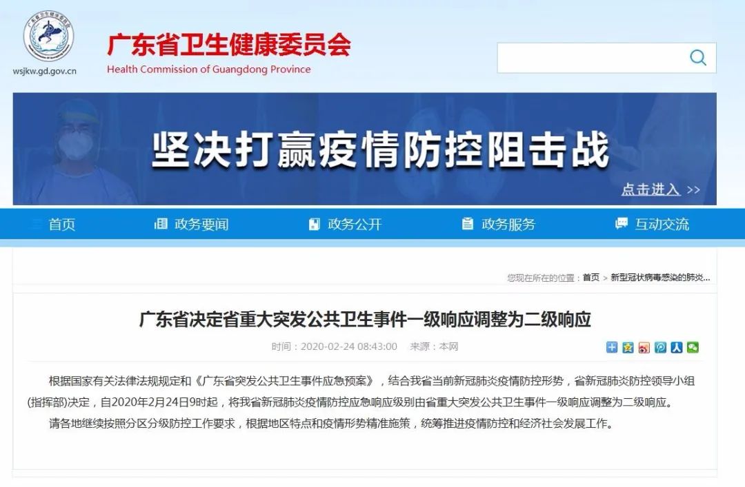 今天(2月24日)上午,廣東省衛生健康委發布信息:省新冠肺炎防控領導小組(指揮部)決定,自2020年2月24日9時起,將廣東省新冠肺炎疫情防控應急響應級別由省重大突發公共衛生事件一級響應調整為二級響應。