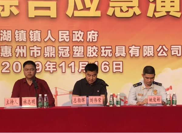 本次演練活動由湖鎮鎮人民政府主辦,惠州市鼎冠塑膠玩具有限公司承辦,湖鎮鎮黨委副書記、鎮長劉偉榮擔任總指揮,演練活動由鎮委委員、副鎮長林志明主持。參加本次演練的單位和人員有:惠州市鼎冠塑膠玩具有限公司、湖鎮專職消防隊、湖鎮派出所、響水交警中隊、湖鎮衛生院、安監所、環保辦、宣傳辦等政府相關部門工作人員。