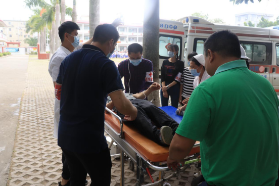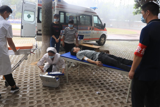 本次現場實兵演練,情景是因電線短路而引發火災的過程。在發生緊急火險事故時,學校進行了初步處置,并開始緊急疏散人群。與此同時,學校各隊伍拉起應急警報,學校安全員將信息報送至鎮政府、鎮專職消防隊,鎮各專業應急隊伍收到信息后立即趕往現場,開展系列應急處置,通過廣播安撫師生情緒,鎮專職消防隊撲滅大火,醫護人員幫受傷傷者進行消毒和包扎。最后,事故處置成功。
