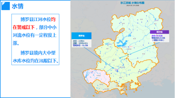 目前,博羅縣江河水位均在警戒以下,部分中小河流水位有一定程度上漲(見水情圖);預計今年“龍舟水”總體可能會偏重;6月份降雨正常略偏多,后汛期正常略偏少;博羅水文站今年可能出現7000m/s的洪水;部分中小河流出現超警洪水的概率大。土壤含水量已經高度飽和,致災風險較大,特別要警惕強降水引發的城鄉積澇、山洪及山體滑坡、崩塌、泥石流等次生災害。