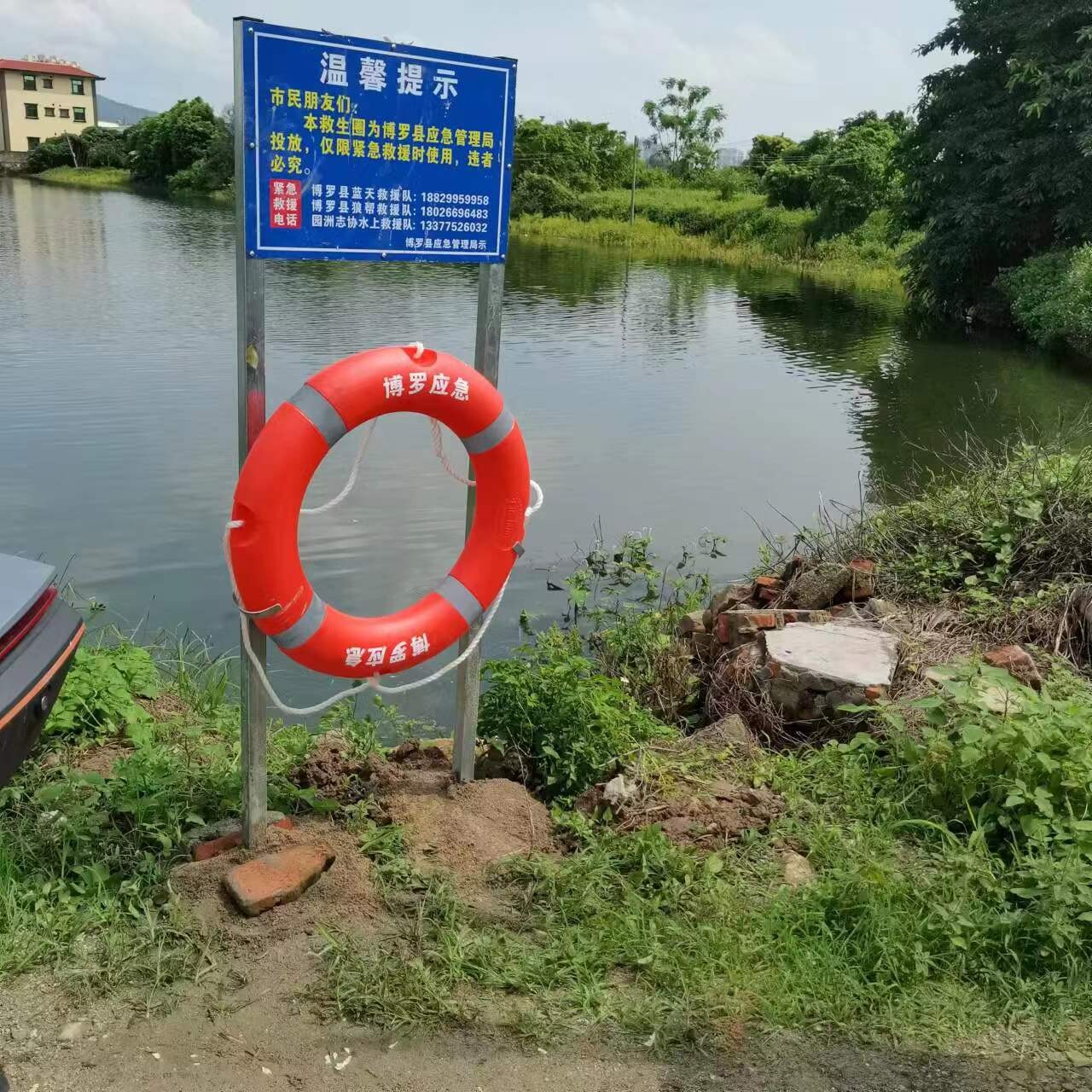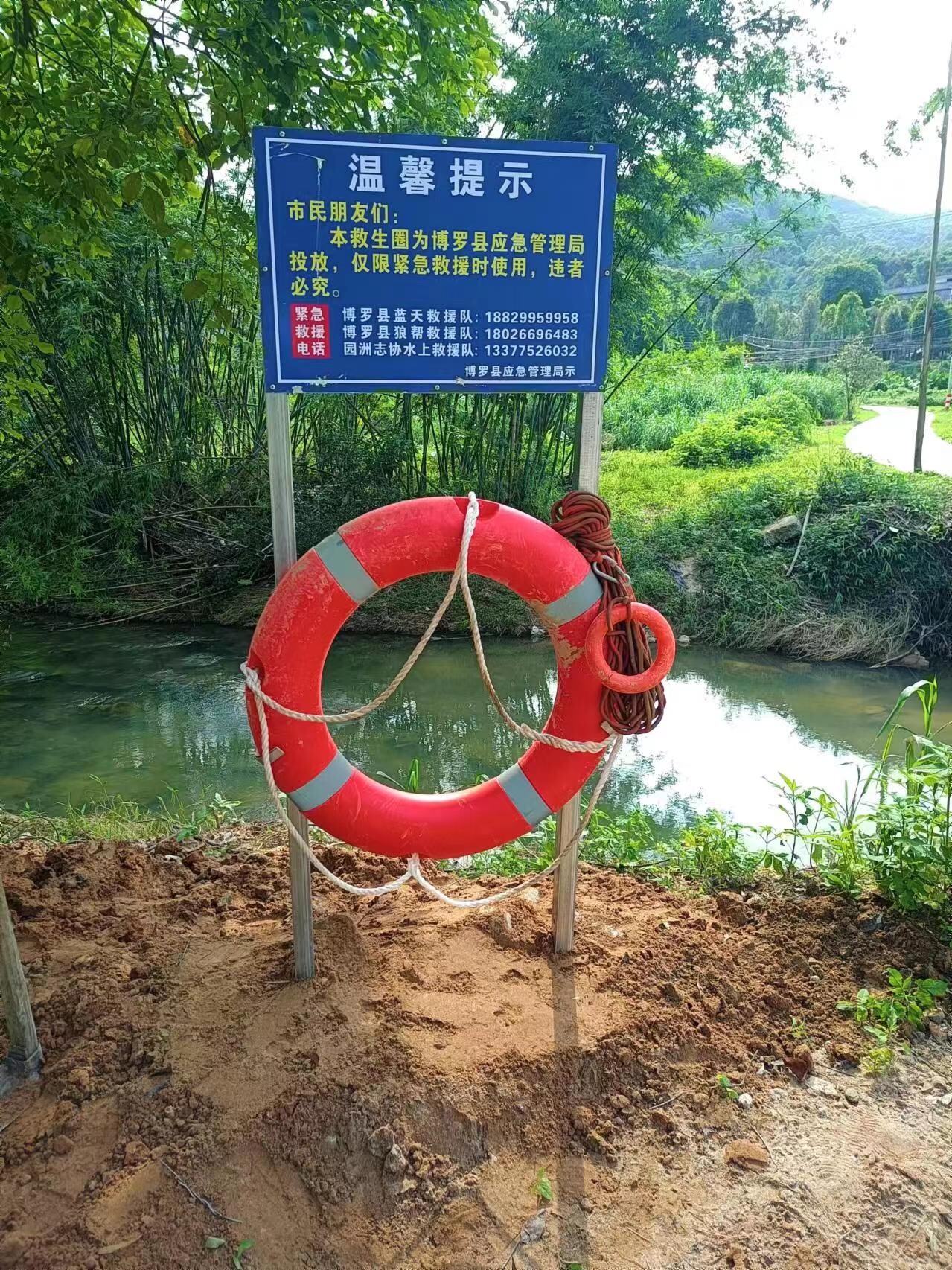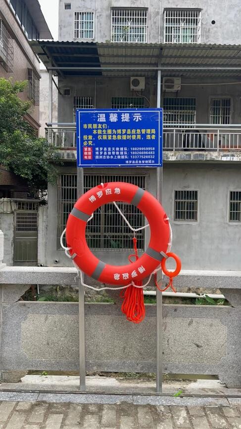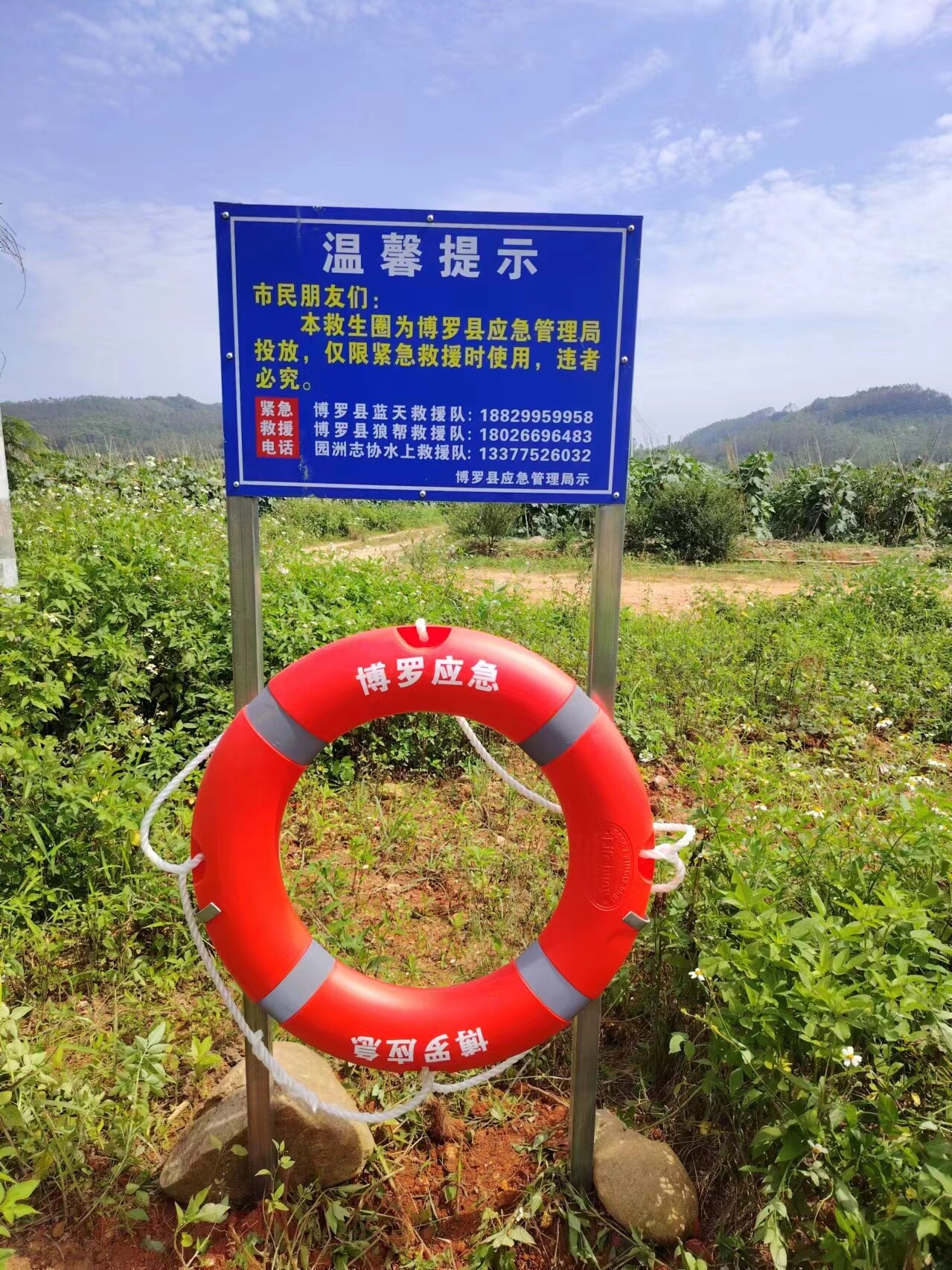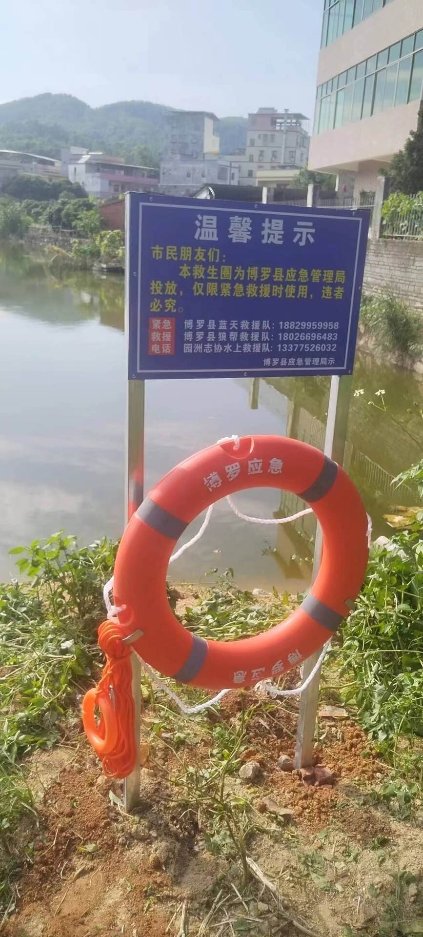 博羅縣應急管理局配置給18個鎮(街)與3支公益救援隊于江河湖庫沿岸區域內總共投放安裝1000套救生圈等救援器材,支架警示牌上掛救生圈和救生繩,上面標示著社會公益救援緊急電話。安全工作無小事,一旦發生溺水事故,保證安全情況下展開營救,保障落水者和救援者的生命安全。架起生命守護網。