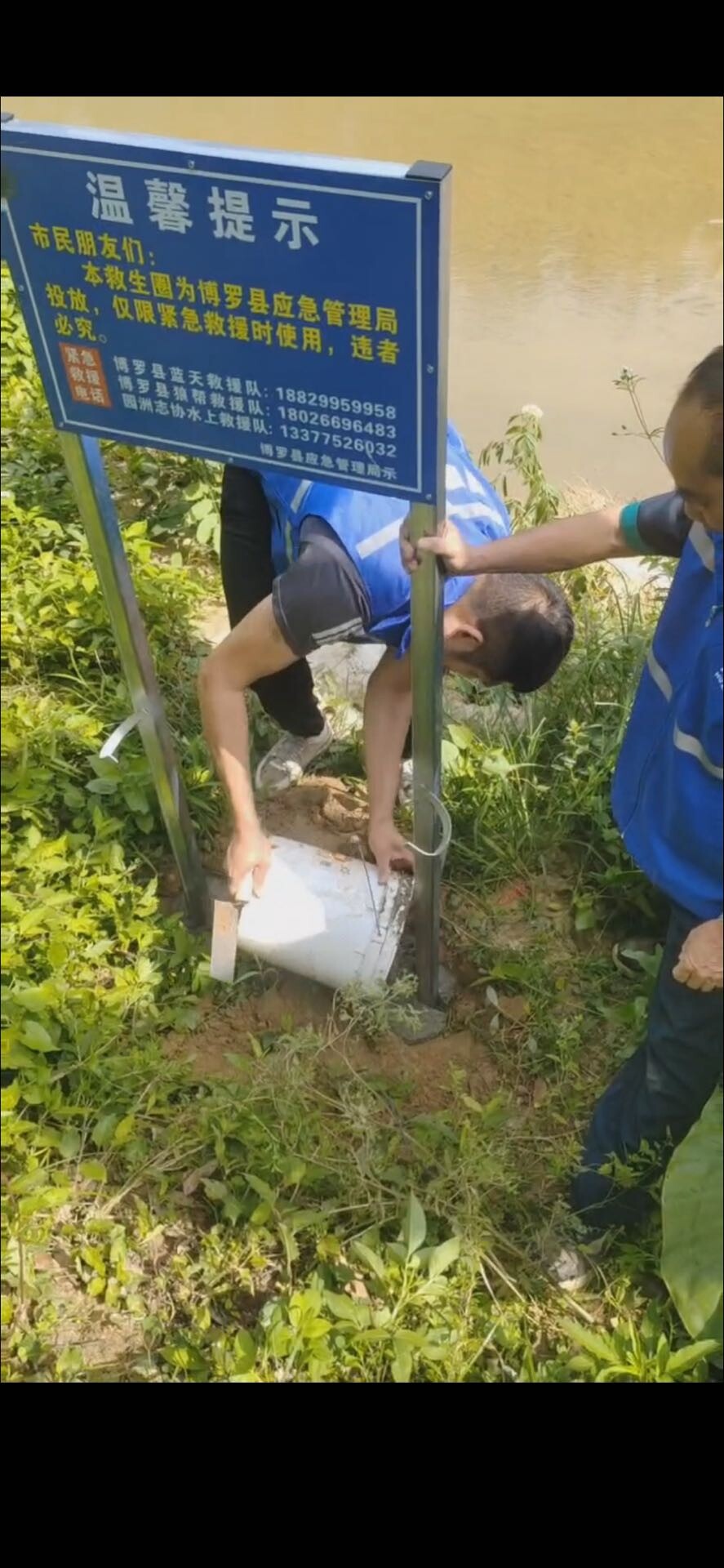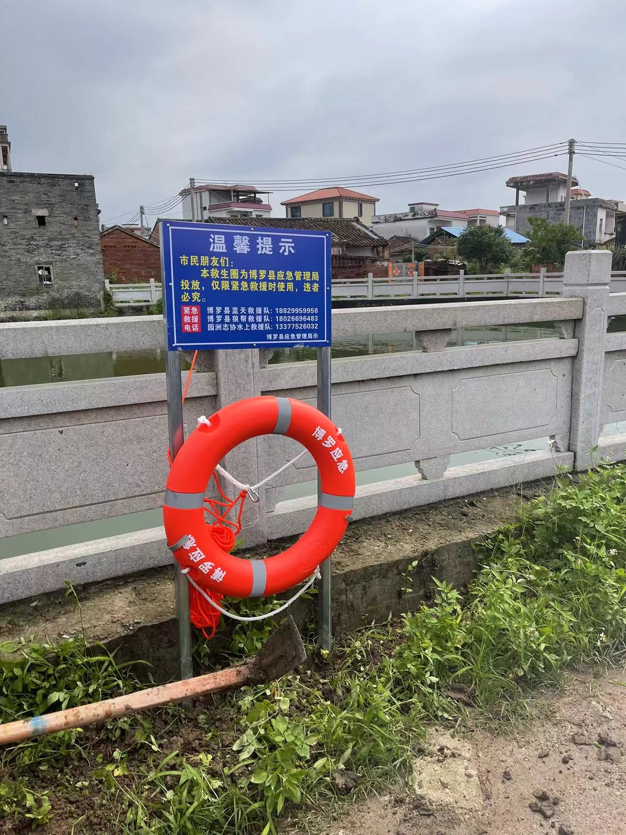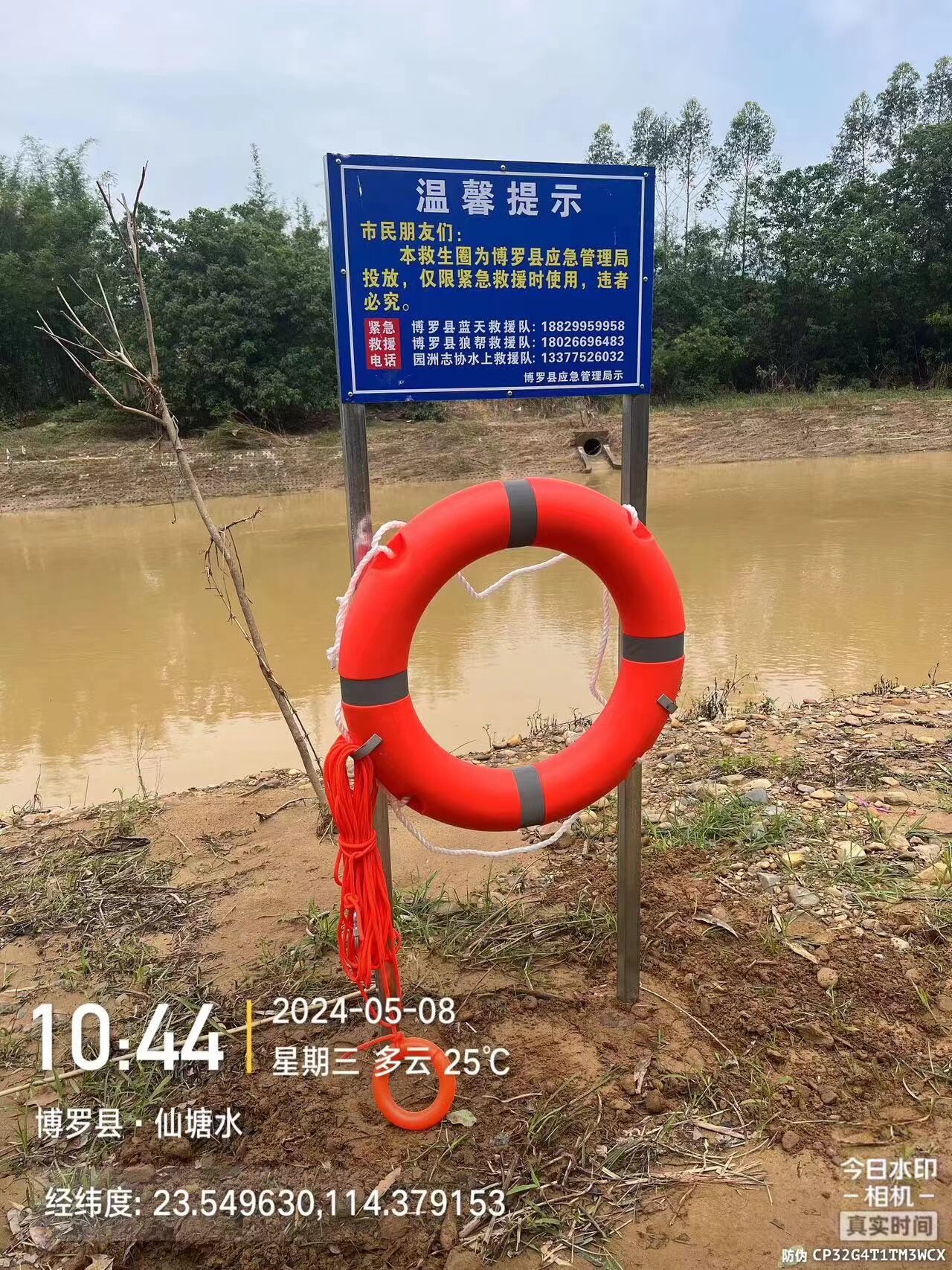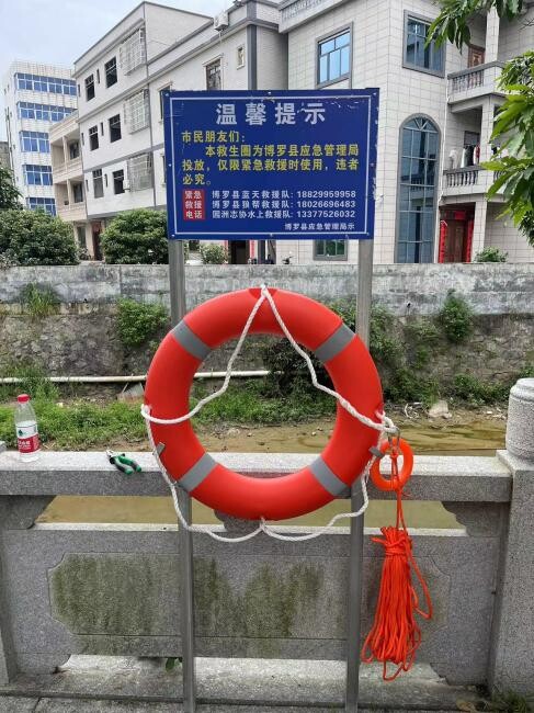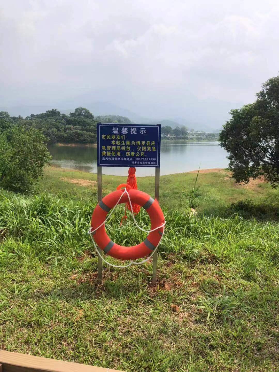 博羅縣應急管理局配置給18個鎮(街)與3支公益救援隊于江河湖庫沿岸區域內總共投放安裝1000套救生圈等救援器材,支架警示牌上掛救生圈和救生繩,上面標示著社會公益救援緊急電話。安全工作無小事,一旦發生溺水事故,保證安全情況下展開營救,保障落水者和救援者的生命安全。架起生命守護網。