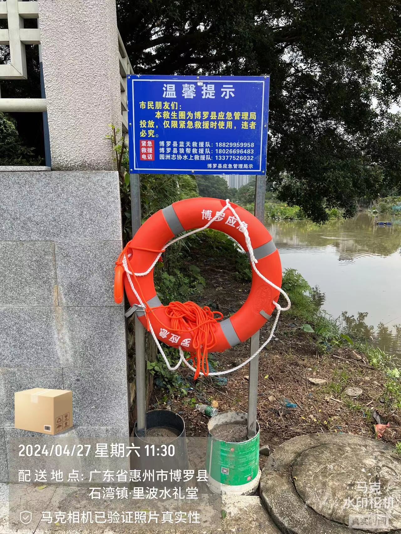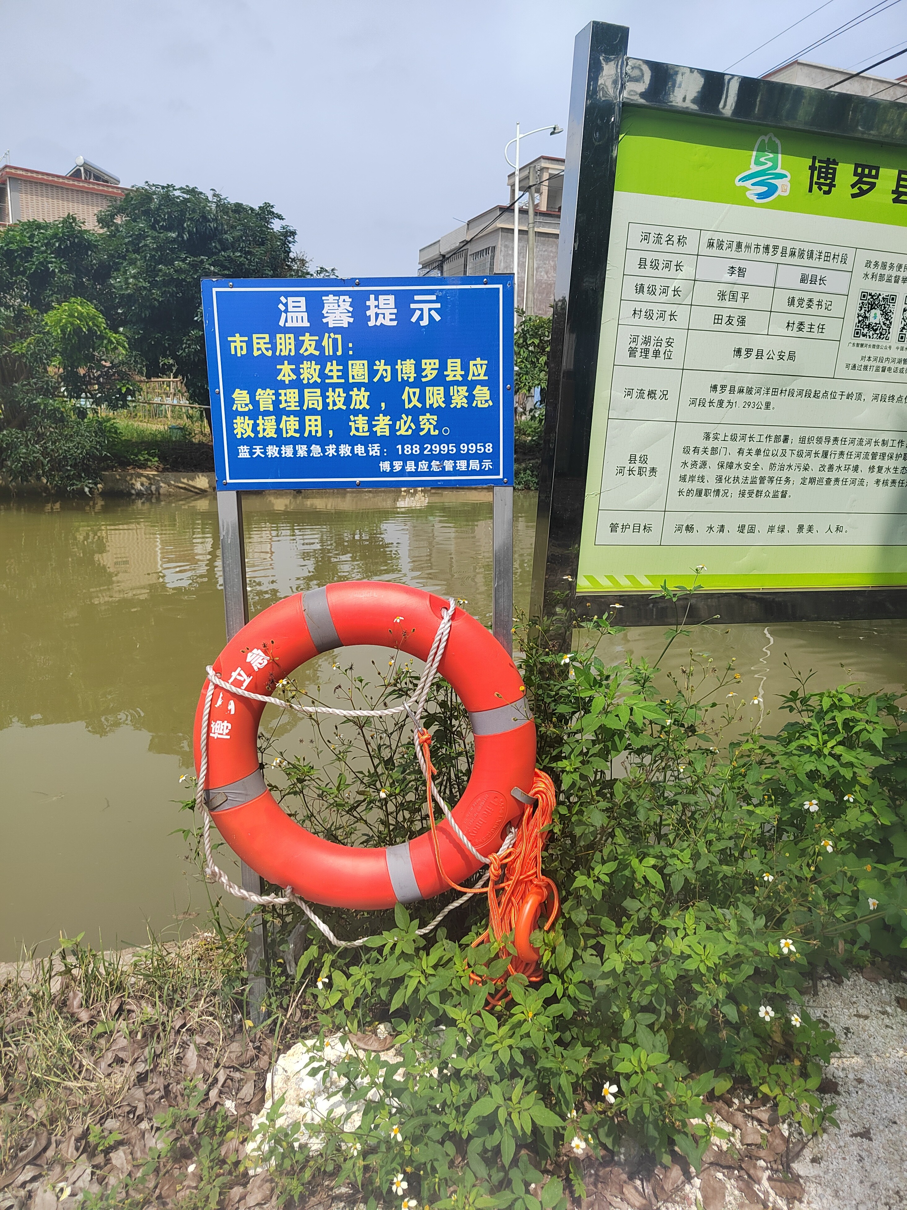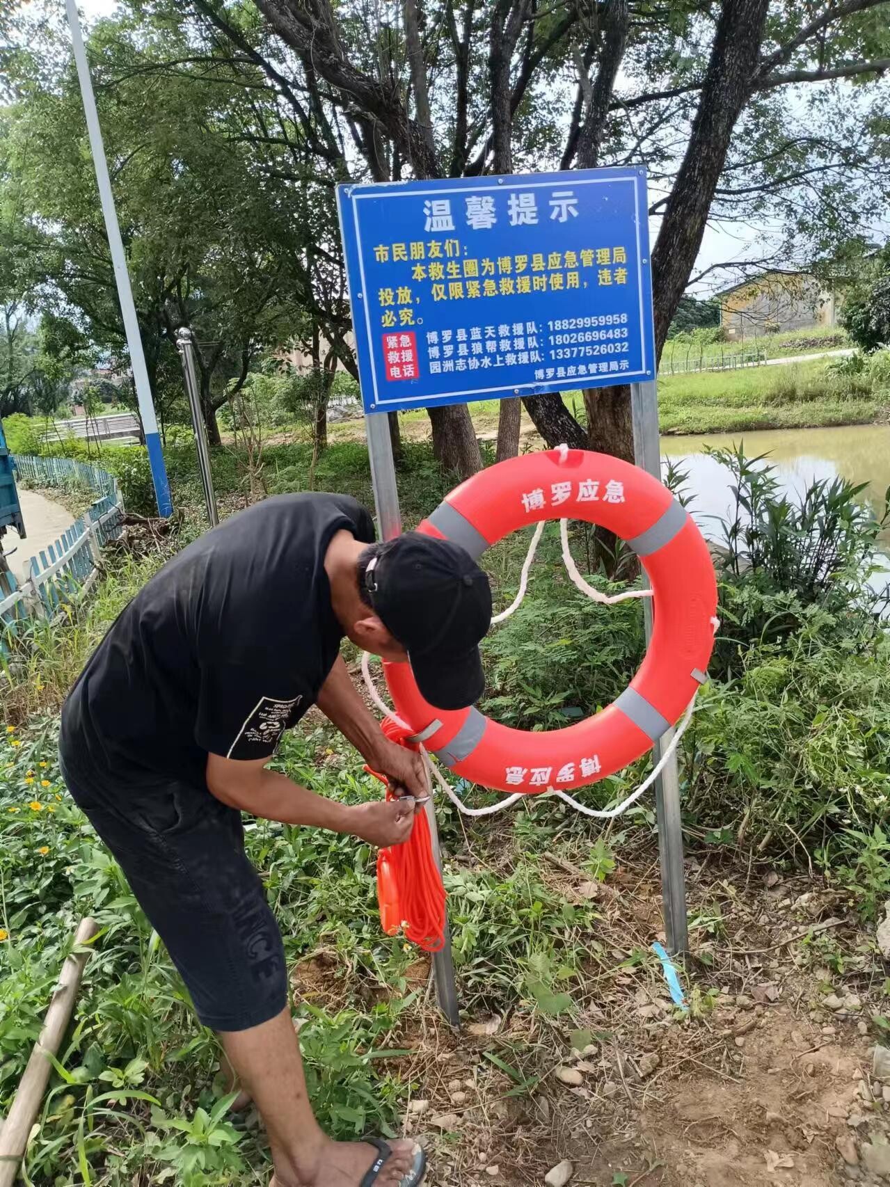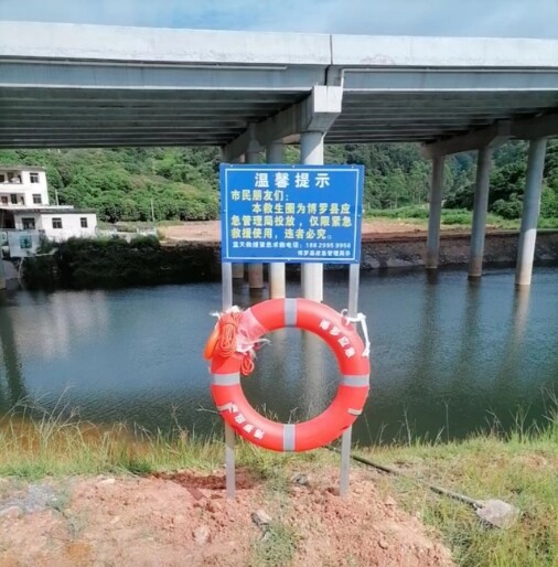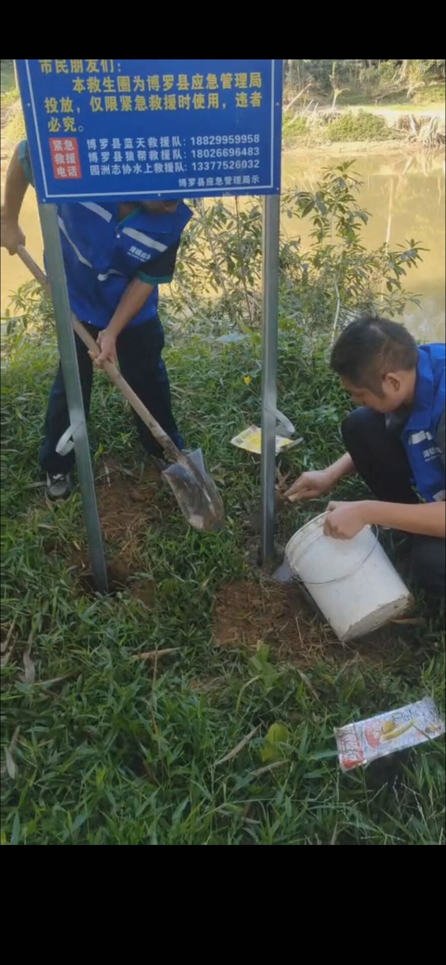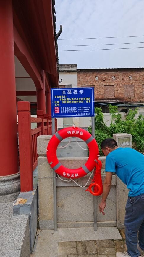 博羅縣應急管理局配置給18個鎮(街)與3支公益救援隊于江河湖庫沿岸區域內總共投放安裝1000套救生圈等救援器材,支架警示牌上掛救生圈和救生繩,上面標示著社會公益救援緊急電話。安全工作無小事,一旦發生溺水事故,保證安全情況下展開營救,保障落水者和救援者的生命安全。架起生命守護網。