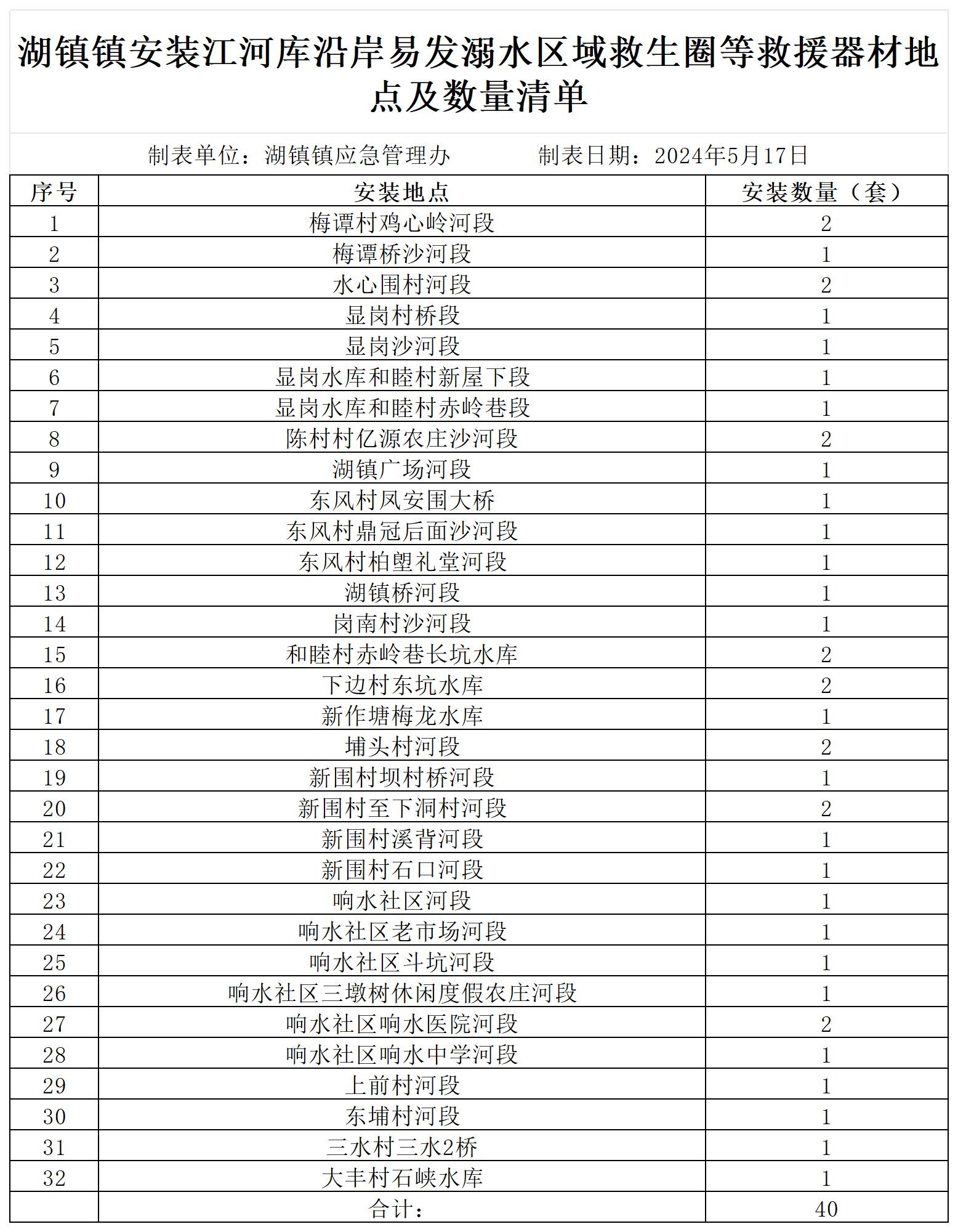 根據上級防溺水事件安全防范工作部署,溺水事故進入高發期,為進一步筑牢生命安全防線,完善應急配套設施,第二批救生圈等救援器材于2024年4月22日起配送至各鎮街和公益救援隊進行投放并安裝。截止于2024年5月21日各鎮街和公益救援隊基本完成救生圈等器材安裝并持續維護工作。