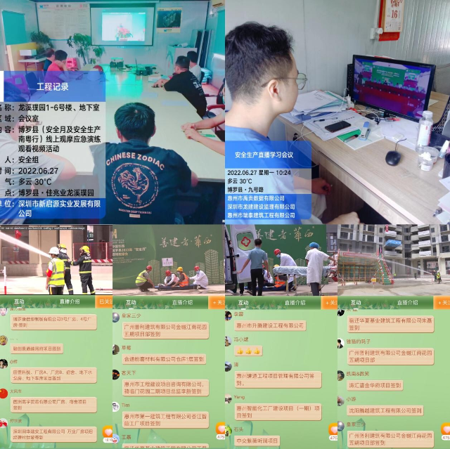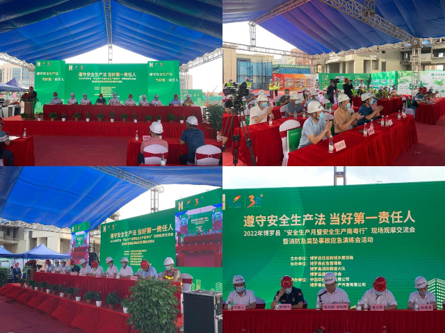 今年6月是第21個全國“安全生產月”,主題是“遵守安全生產法 當好第一責任人”。為深入貫徹落實習近平總書記關于安全生產重要論述和重要批示指示精神,全面推進我縣建筑施工“安全生產月暨安全生產南粵行”活動,提高我縣工程建設管理水平及工人的安全意識,增強建設項目與應急管理、醫院、消防等部門的溝通聯動,2022年6月27日,博羅縣住建局在碧桂園·匯悅臺項目舉行現場觀摩及應急演練線上直播交流會,縣住建局黨組成員、副局長張旭明及質安股、安監站、質監站相關工作人員,縣應急局指揮中心、縣消防救援大隊羅浮山消防救援站相關工作人員,縣建筑業協會、中國華西企業有限公司、博羅縣遠景房地產開發有限公司等單位代表參加了交流會,我縣所有在建項目的建設、施工、監理等參建單位通過手機、電腦等方式線上觀看了直播。