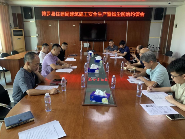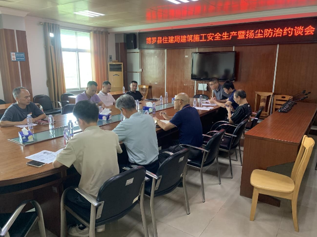 為貫徹落實習近平總書記關于安全生產重要論述和重要指示批示精神,堅持人民至上、生命至上理念,深入開展建筑工地揚塵防治工作,進一步提升全縣建筑工地揚塵綜合治理工作成效,確保揚塵防治“7個100%”措施到位,根據《博羅縣污染防治攻堅戰重點工作督導交辦單》(縣督導大氣〔2023〕第28號)、(縣督導大氣〔2023〕第30號)要求,結合《惠州市揚塵污染防治條例》等相關規定,2023年7月3日,縣住建局在局西北路辦公區六樓會議室召開建筑施工安全生產暨揚塵防治約談會,局施工安全部相關工作人員及博羅縣城富華花園等23個小區老舊小區改造項目、天翔科技產業園廠房項目參建單位相關負責人參加會議。