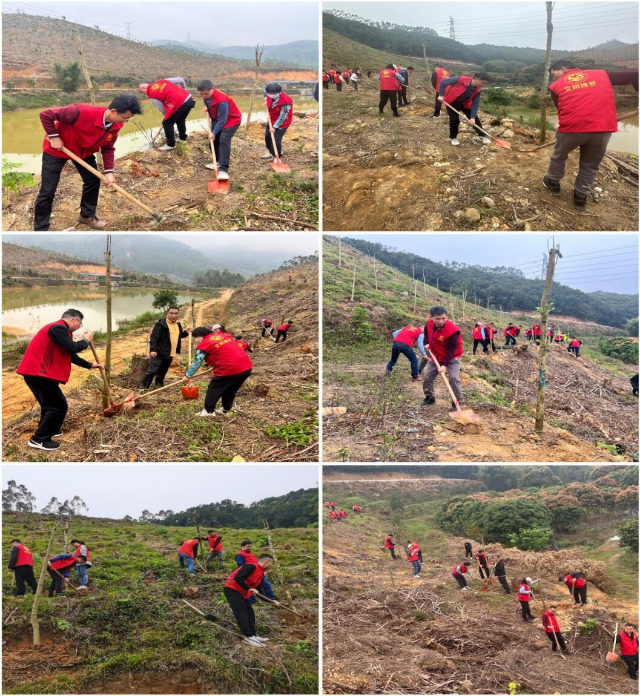 植樹現場,春意盎然,呈現一片忙碌的景象。班子成員與黨員干部、青年志愿者們幾人一組,配合默契,干勁十足,揮鍬鏟土、扶直苗木、培實新土、提桶澆水,熟練認真地完成著每一道栽植工序。經過一番辛勤勞動,一株株新綠昂然挺立,在這片山坡上“安家落戶”,為整座山頭增添了新的生機和活力。此次活動共種植火焰木80余株。
