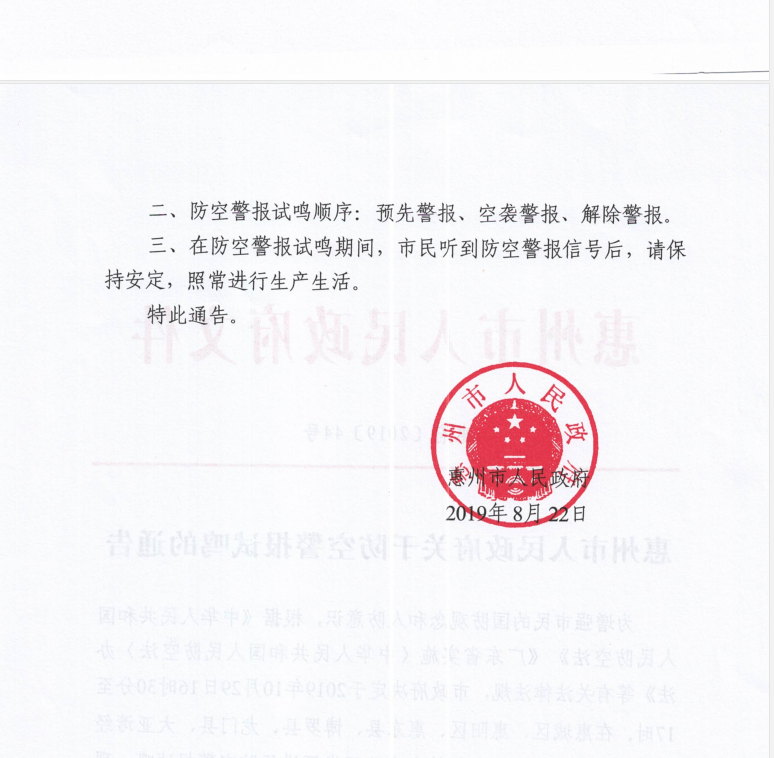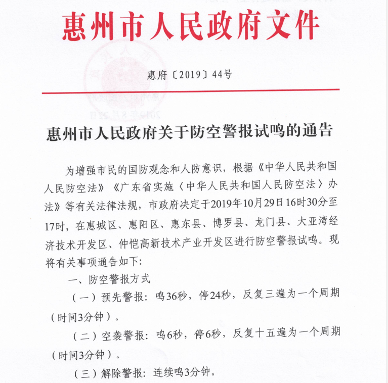 附件:惠州市人民政府關于防空警報試鳴的通告