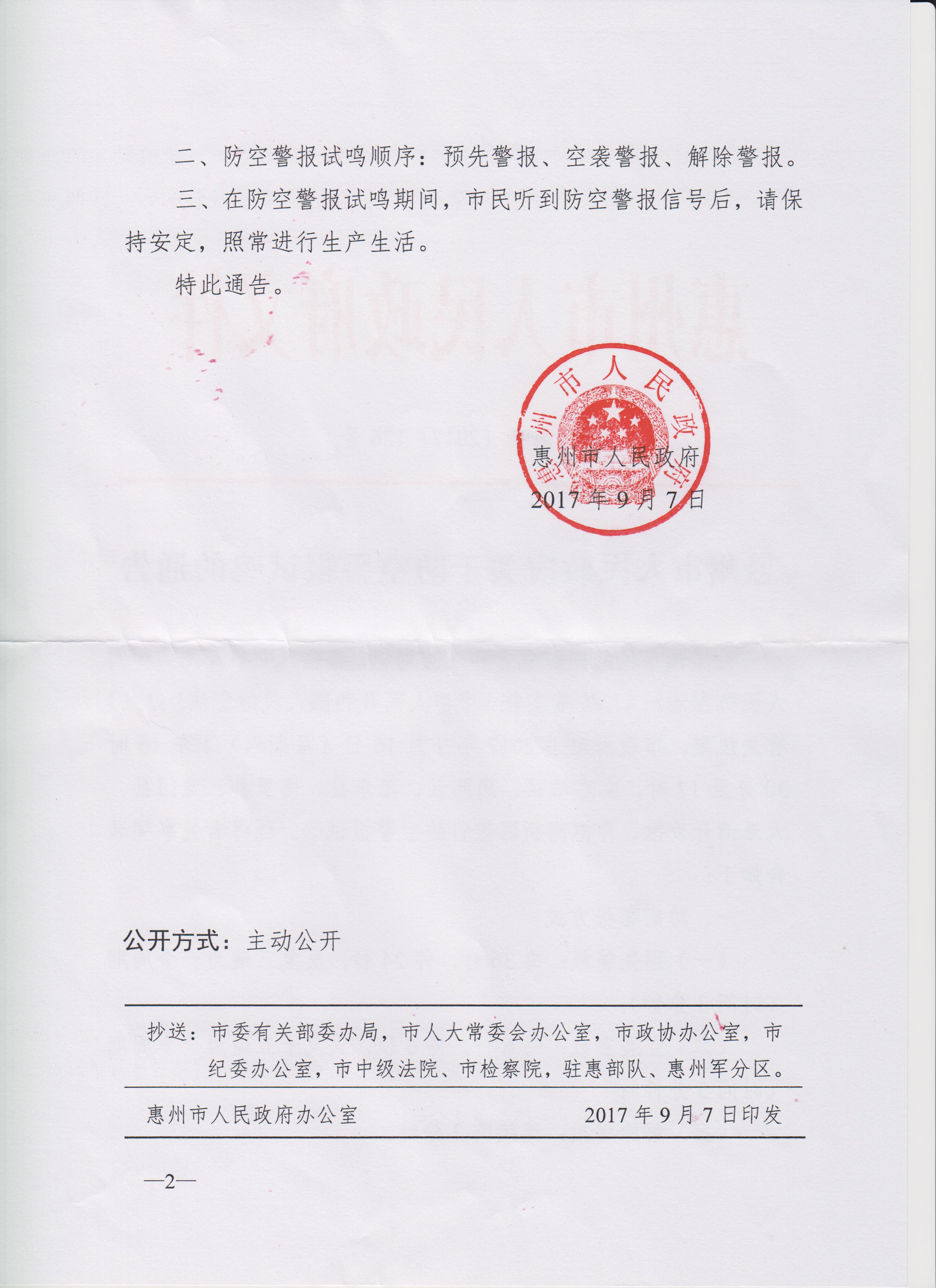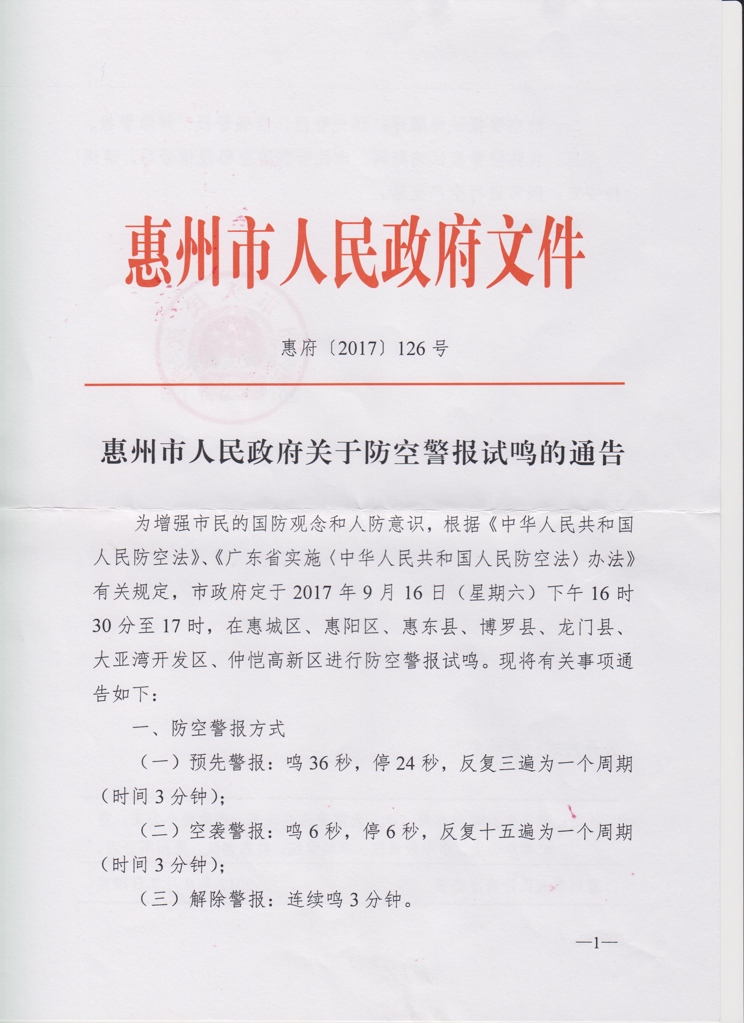 惠州市人民政府關(guān)于防空警報(bào)試鳴的通告