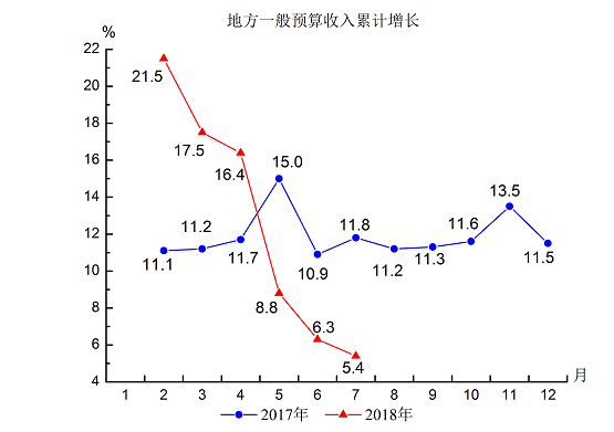 經濟運行下行壓力不減。從工業看,6月份以來,工業增加值增幅逐步回落,增速從1-3月的7.5%下降到1-7月的2.2%。從投資看,工業投資雖然增幅有所回升,但增速仍然處于低位,1-7月僅增長6.3%。從財政看,一般公共預算收入增速逐月回落,增速從1-2月的21.5%下降至1-7月的5.4%