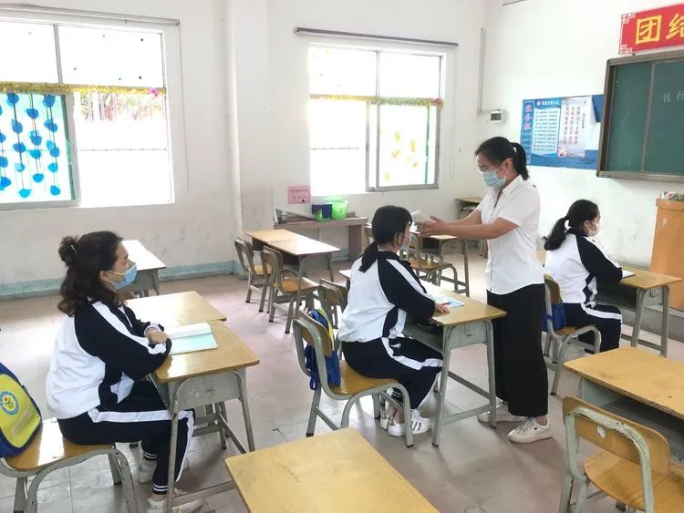 3、邱校醫用體溫計測量廖老師的體溫,發現廖老師體溫偏高,經過詢問發現廖老師有重點疫區旅居史并做好登記。邱校醫立即將廖老師帶到臨時觀察室,并將情況上報給學校疫情防控應急處置領導小組的組長鄭向東校長。