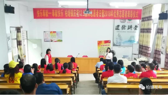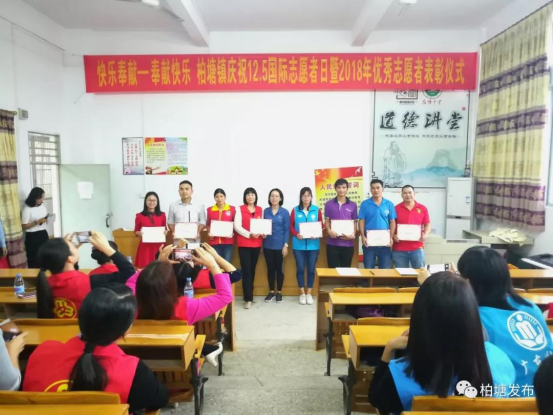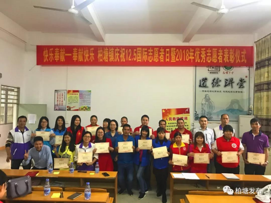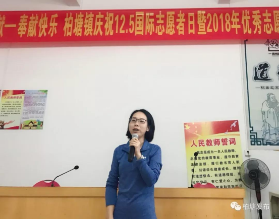 12月5日,是國際志愿者日。為了弘揚奉獻社會、關愛他人的高尚精神,今天下午,柏塘鎮在柏塘中學舉行了慶祝“12·5”國際志愿者日暨2018年優秀志愿者表彰儀式。鎮黨委委員梁敏麗同志、鎮婦聯、團鎮委、柏塘鎮各志愿服務團體以及柏塘中學師生代表共50人參加了活動。