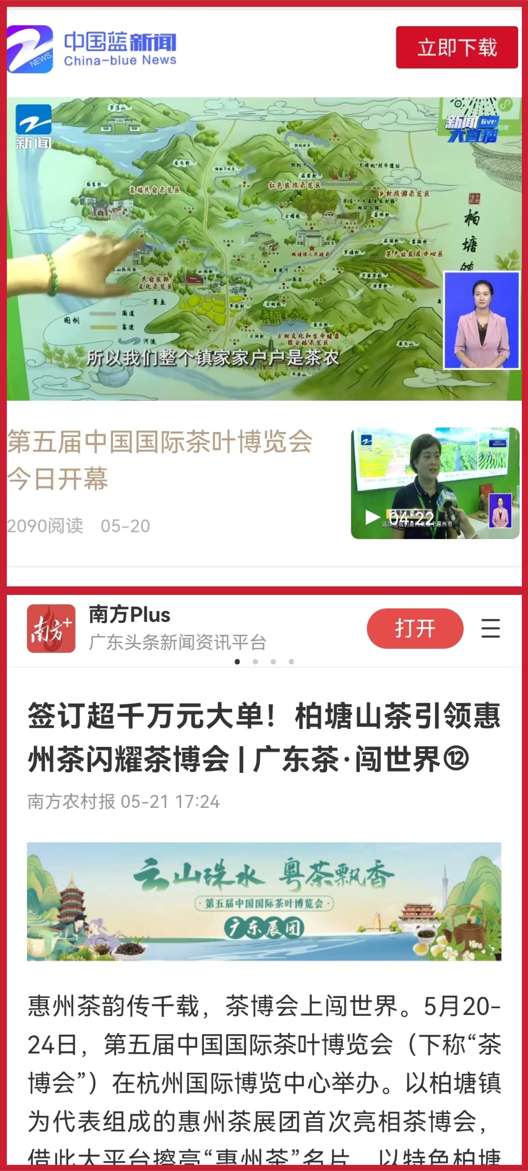 5月20日上午,在國際采購商廣東專場茶葉品牌、新品推介會上,柏塘山茶代表惠州精彩亮相。在推介會上,柏塘主動把握機遇,全方位多角度展示了柏塘近年來以特色茶產(chǎn)業(yè)繪就鄉(xiāng)村振興新畫卷的豐碩成果,獲得國家和省農(nóng)業(yè)農(nóng)村部門以及中國茶葉學(xué)會、新加坡國際茶葉研究院等國際國內(nèi)業(yè)權(quán)威機構(gòu)高度贊譽。同時浙江新聞頻道《新聞大直播》、浙江衛(wèi)視生活頻道、杭州都市快報以及南方農(nóng)村報等媒體紛紛在展會期間聚焦柏塘茶產(chǎn)業(yè)的發(fā)展,進行了系列采訪報道。