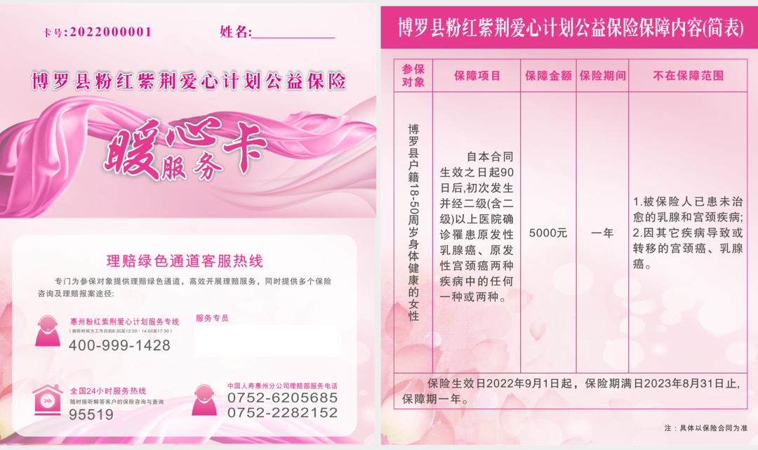 2023年博羅縣“粉紅紫荊愛心計劃”公益保險捐贈活動即將開始,博羅縣域居住(不限戶籍)出生28天至18周歲的兒童可免費領取人均保額5500元的“護童”保險;博羅縣戶籍18至50周歲身體健康的女性(已確診惡性腫瘤的女性除外)可免費領取人均保額5000元的“兩癌”保險,保障時間為2023年9月1日至2024年8月31日。