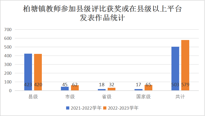 2022~2023學年,學校教師個人能力水平及整體教學質量均實現新突破,轄區內教師參加縣級以上評比獲獎或在縣級以上平臺發表作品共計579人次,比去年增長了76人次,其中,獲得國家級獎項65次,同比增長率高達282%,省級32次,市級62次,縣級420次,全方位呈上升趨勢。2023年,全鎮共新招收教師41人,全鎮教育師資力量正愈發充實。