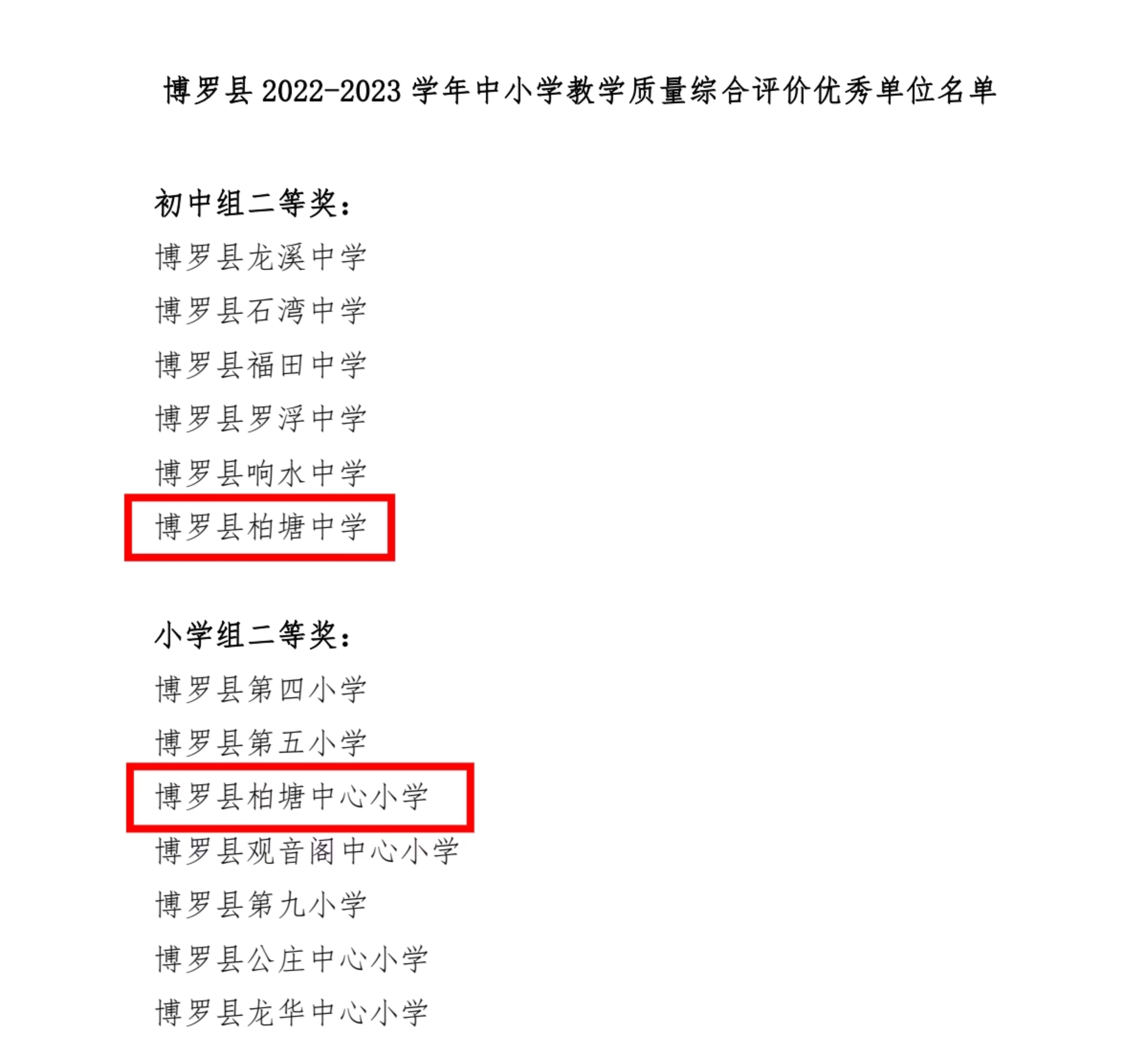 今年中考,柏塘中學在全縣29所公辦初中的排名第7,23所鄉鎮中學排名第3,比2019年進步了15名,實現大幅度跨越。柏塘中心小學在全縣21所鄉鎮公辦中心小學質量檢測中名列第4,從2019年的倒數第3到現在正數第4,其他各學校均有不同程度的進步。柏塘中學、柏塘中心小學均榮獲2022~2023學年博羅縣中小學生教學質量綜合評價優秀二等獎。隨著我鎮教育資源不斷提高,有近200名異地就學的學子紛紛轉回轄區學校就讀,讓學子在家門口就能享受優質的教育資源,同時,減輕了許多家庭的經濟負擔,讓孩子們有了更多的家鄉情懷,推動了教育振興、人才振興,全鎮教育教學成績正不斷上升。