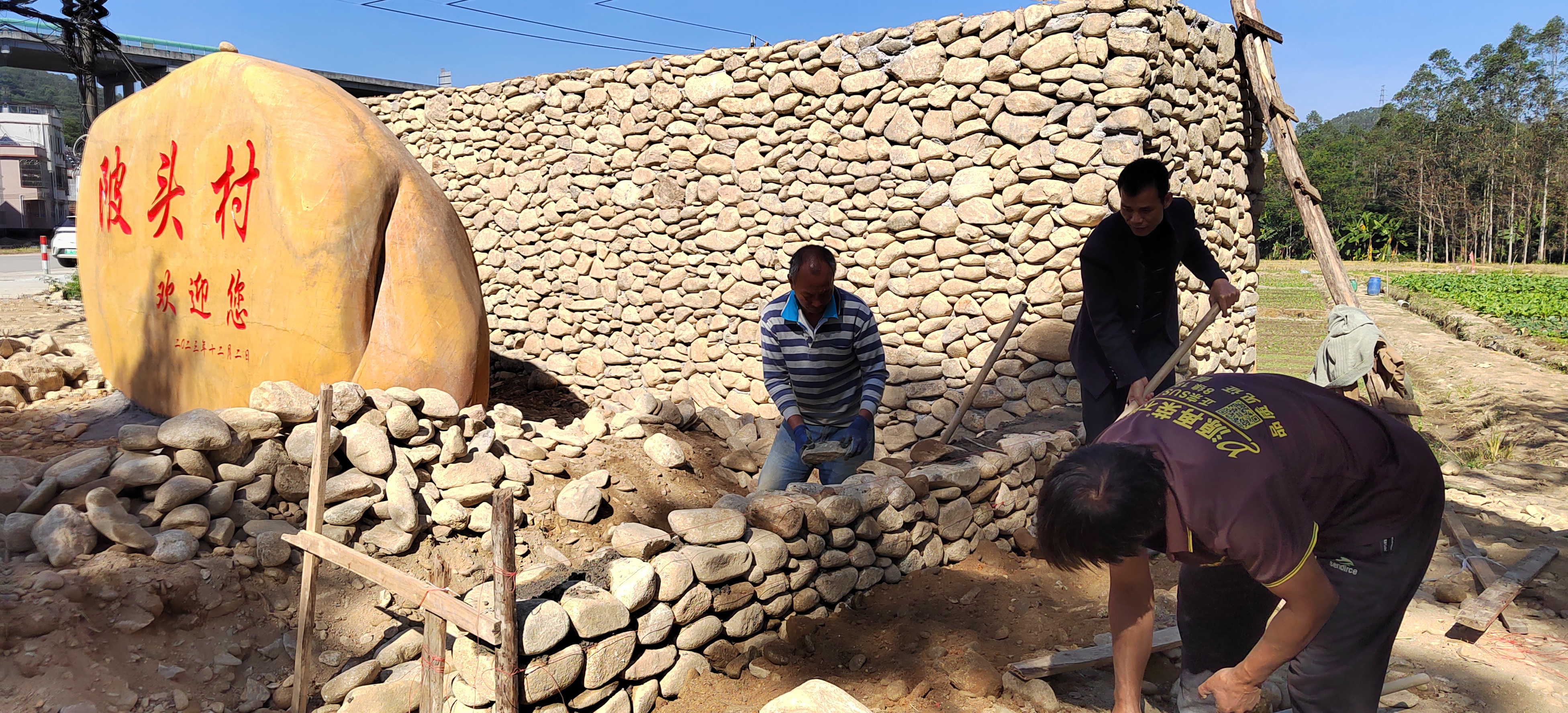 陂頭村就地取材使用河道鵝卵石美化村口建設,群眾自發前往助力