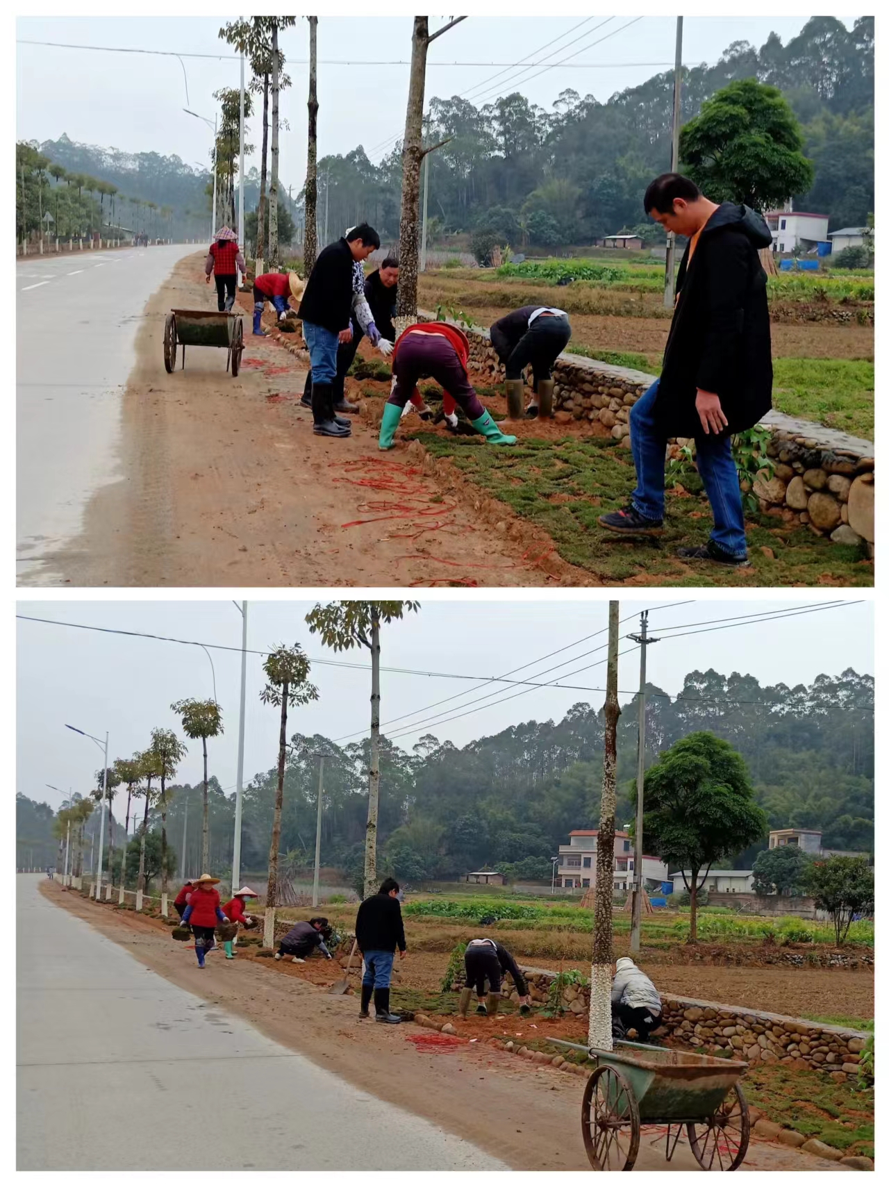 黨員干部帶領村民代表、保潔員利用周末時間種植草皮,齊心合力,綠化家園