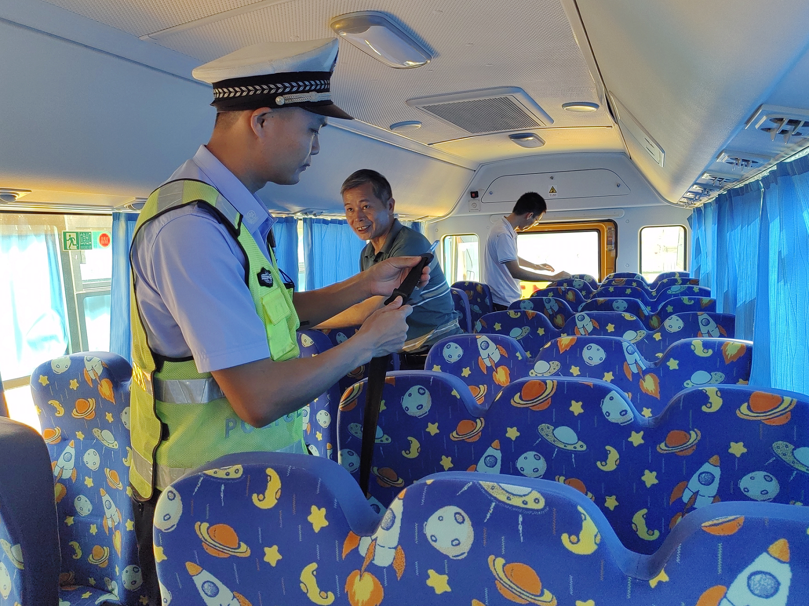 檢查中,民警對校車內外車況和車內安全設施進行詳細檢查,重點對校車的輪胎、停車標識牌、燈光的正常使用狀況、車內的滅火器、安全錘、安全帶、駐車器、急救箱等安全防護設施的配備情況及車輛使用性能進行檢查,對校車駕駛人資質、校車標牌、運行時間、行駛路線、車輛審驗及保險等基本情況進行核對,嚴防“帶病車”上路。