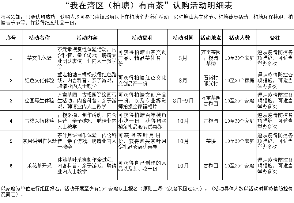 2、“精彩紛呈,玩轉柏塘”(價值6000元)。以家庭為單位(原則上每個家庭不超過4人)享受“我在灣區(柏塘)有畝茶”配套活動6次。除此之外,還可免費參加由柏塘鎮政府舉辦的如柏塘山茶文化節、柏塘徒步活動、柏塘環保撿跑、柏塘音樂節等活動。