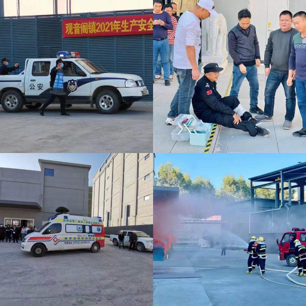 本次演練共設置了兩個場景,采用實地模擬演練和解說相結合方式進行。第一場景模擬企業因廠房電線短路導致起火,火勢蔓延迅速,企業開展綜合救援的過程。第二場景模擬事故中有人員受傷被困,企業展開初期救援,并向鎮相關部門請求支援。接報后,觀音閣鎮政府迅速組織相關應急救援力量趕赴“事故”現場開展搶險救援。