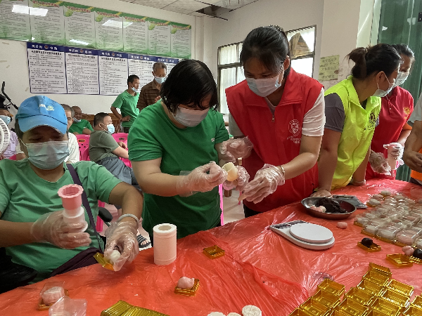 活動現場,志愿者首先向大家介紹了“冰皮月餅”的制作方法,然后為每一位參與者分發了月餅皮、餡料、月餅模具等所需的材料。在志愿者的協助下,大家一起揉皮、加餡、包月餅、放入模具按壓成型。經過差不多兩小時的制作,一個個晶瑩剔透的冰皮月餅完成了。大家一起品嘗交流,現場氣氛溫馨熱鬧。
