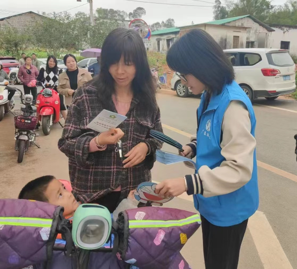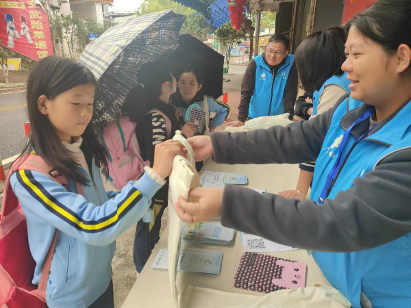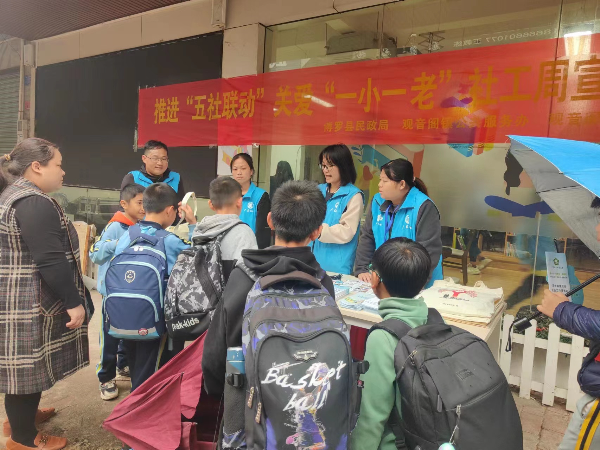 放學時間,社工們在觀音閣中心小學門口發放宣傳折頁,為學生家長們宣講民政救助政策,引導群眾關注社工站公眾號,招募以小學生為對象的小小志愿者。