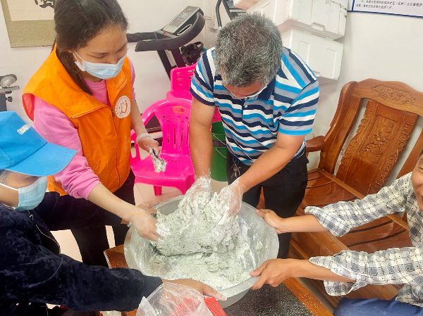 活動中,社工向大家介紹清明節的由來和習俗,同時講解制作艾粄的步驟。大家一起團結協作,采摘艾葉、清洗、焯水、切碎、備餡、和面、揉團、開蒸……不一會兒,一個個碧綠如玉的艾粄呈現在大家眼前,整個活動在大家的歡聲笑語中推向了高潮。