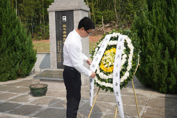 最后,全體人員緩步,向烈士紀念碑敬獻鮮花、行鞠躬禮,瞻仰烈士紀念碑并繞行紀念碑一圈。
