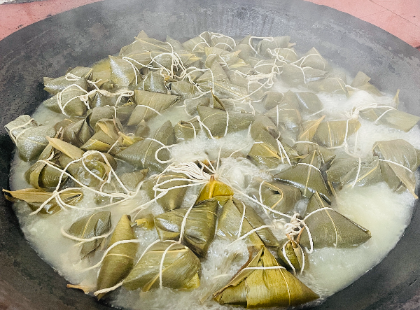 活動(dòng)現(xiàn)場(chǎng),志愿者們?cè)缭鐏?lái)到活動(dòng)室,準(zhǔn)備好糯米、粽葉、五花肉等食材。他們分工合作,有的負(fù)責(zé)清洗粽葉,有的負(fù)責(zé)準(zhǔn)備餡料,有的則開(kāi)始動(dòng)手包粽子。在熟手志愿者的帶領(lǐng)下,大家迅速掌握了包粽子的技巧,一片片粽葉在大家手中翻飛,不一會(huì)兒,一個(gè)個(gè)形態(tài)美觀的粽子便呈現(xiàn)眼前,現(xiàn)場(chǎng)歡聲笑語(yǔ)、氣氛熱烈,處處彌漫著粽葉的清香。包完粽子后,志愿者們又忙著生火煮粽。隨著鍋中水漸漸沸騰,粽子的香氣也逐漸彌漫開(kāi)來(lái),整個(gè)活動(dòng)室充滿了節(jié)日的溫馨與歡樂(lè)。