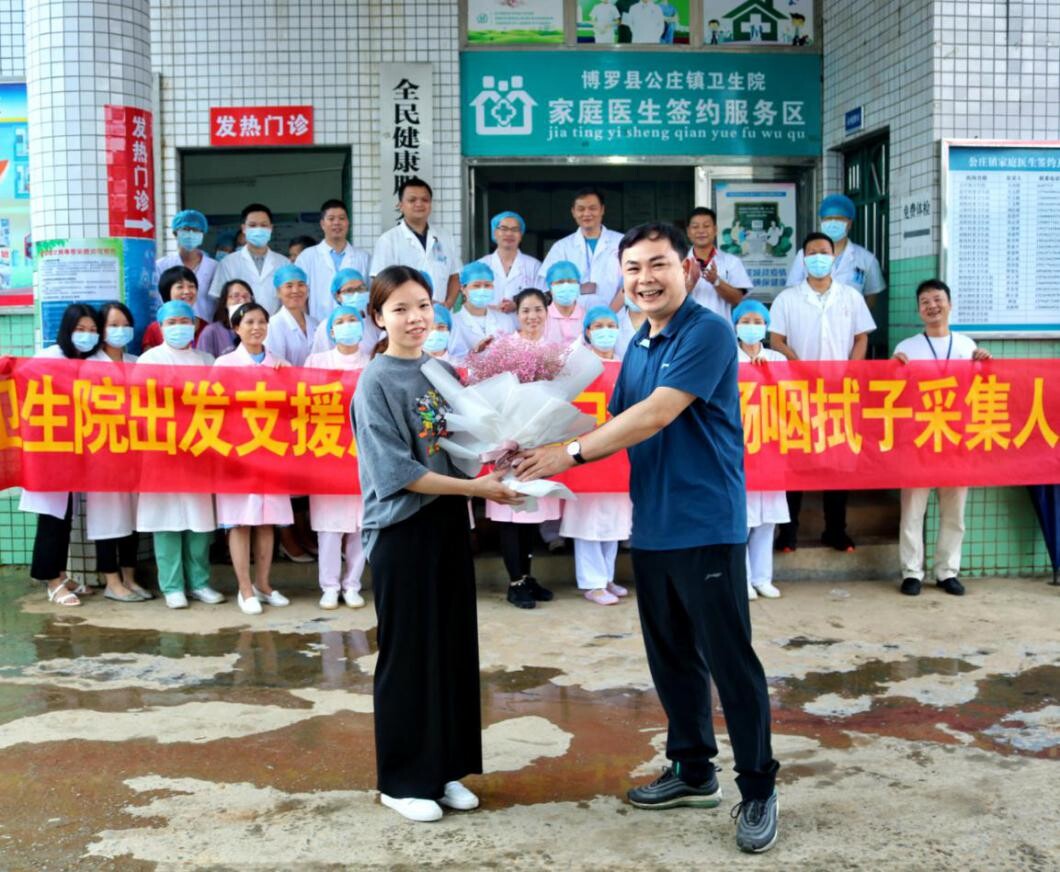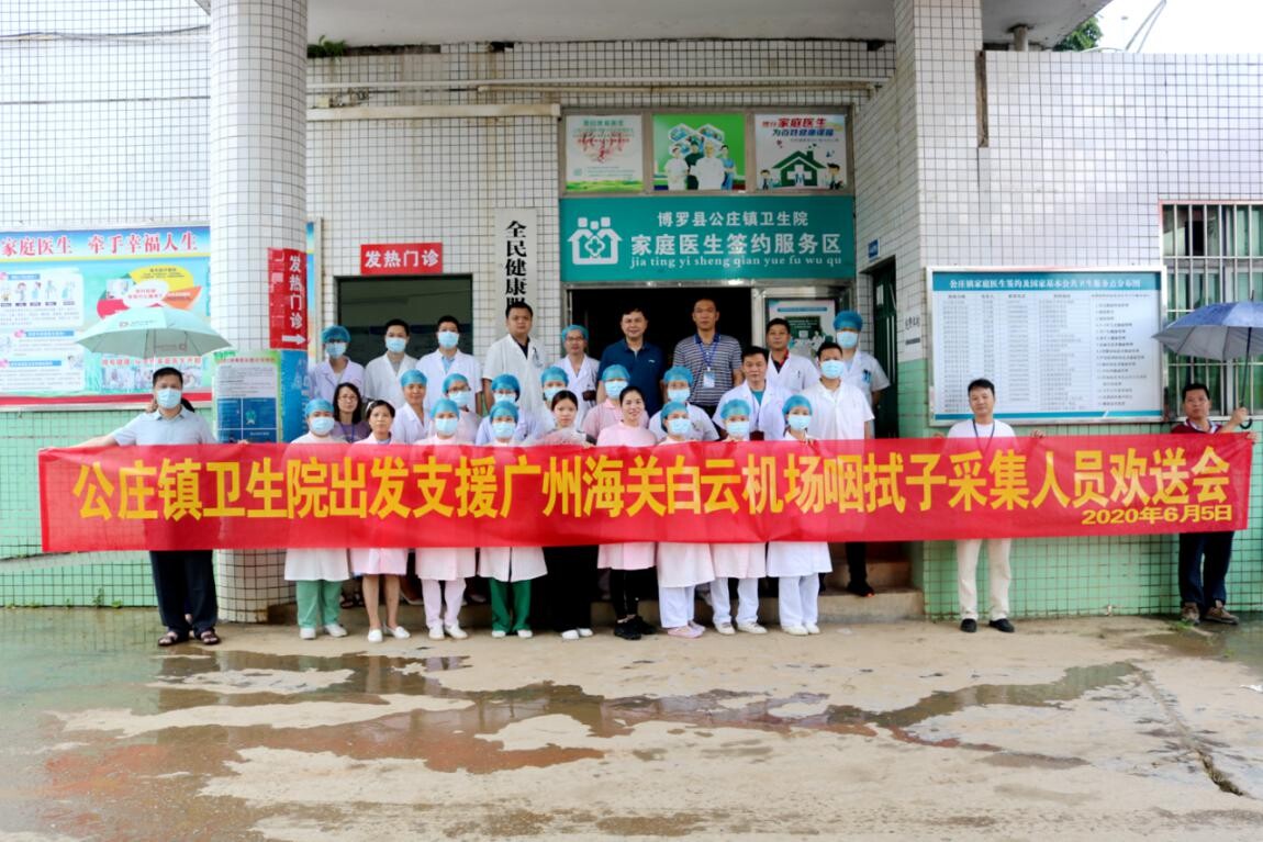 6月5日上午,公莊鎮衛生院內熱鬧非凡,鎮委委員陳勝旺、衛生院院領導、職能科室代表及相關科室領導、同事大家歡聚一堂,歡送李秋婷護士前往廣州海關白云機場支援咽拭子采集工作。