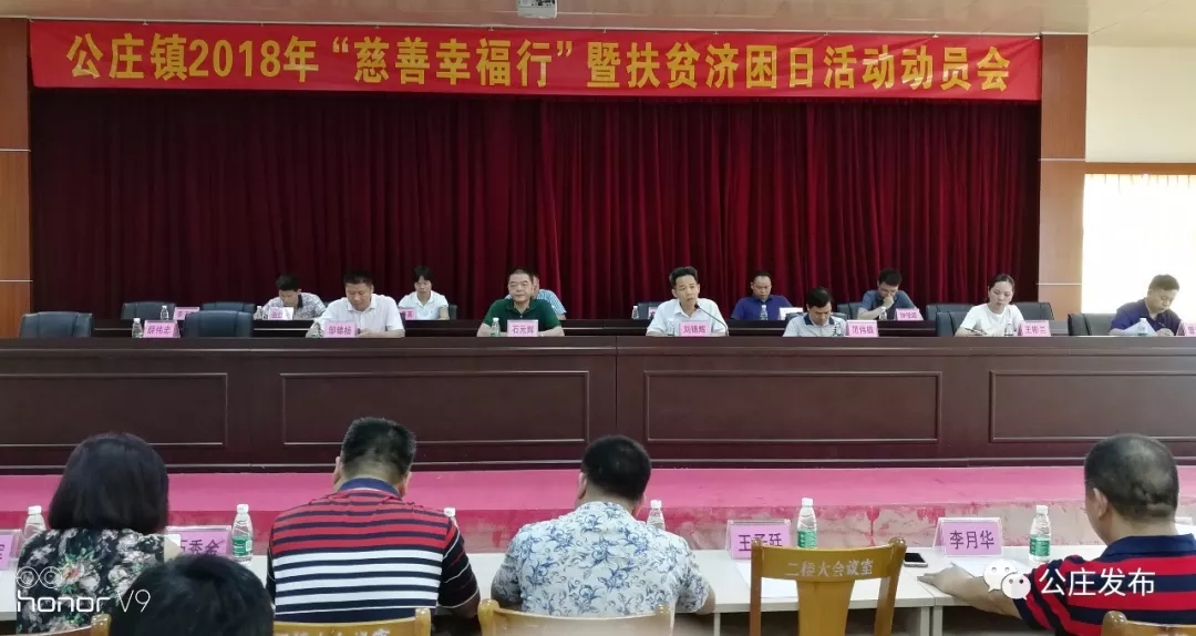 為廣泛動員社會力量共同參與公莊全民慈善行動和扶貧濟困日活動,根據市、縣相關文件精神,2018年6月29日上午,公莊鎮在政府二樓大會議室組織召開2018年“慈善興福行”暨扶貧濟困日活動動員會。會議由鎮委副書記劉錦輝主持,鎮人大副主席曾宏林作活動布置發言。鎮三套班子成員、政府全體機關干部、各村(社區)黨支部書記、主任,圩鎮部門負責人,企業、學校負責人共300多人參加會議。