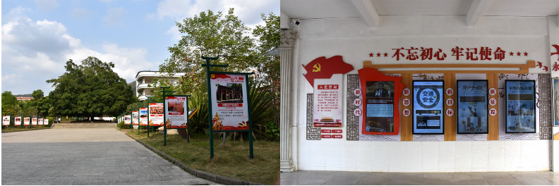 展黨史輝煌,熏陶中學。一是在校園中心校道中心段的兩旁,集中展示了中共一大至中共十九大的彩圖,標明召開的時間、地點、歷史意義及當時的圖片;二是在行政樓入口大堂右邊顯眼位置安裝三個多媒體展示一體機,定時輪番播放黨史知識小視頻、安全教育小視頻、法制教育小視頻、傳統文化小視頻、思政教育小視頻,讓學生在耳濡目染中學到四種常識,營造濃厚的學習氛圍,時刻熏陶師生。