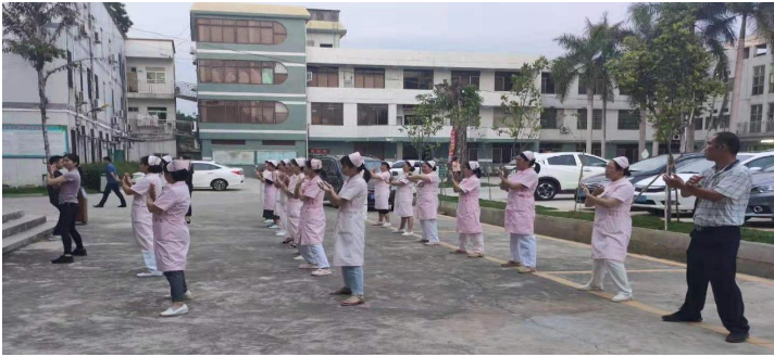 會后,全體護(hù)士進(jìn)行八段錦練習(xí),為增強(qiáng)職工身體素質(zhì)營造良好的氛圍,樹立榜樣。