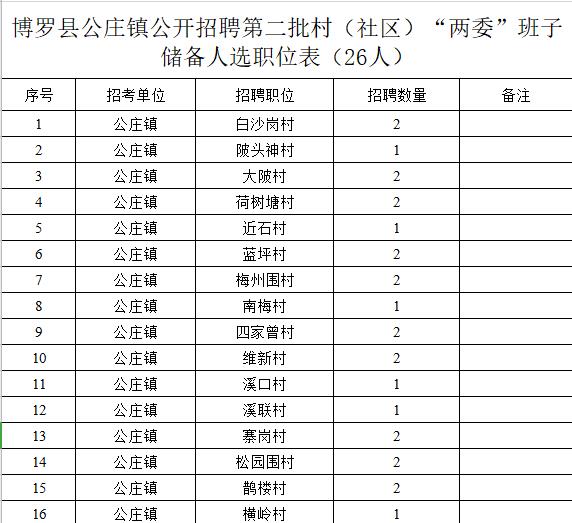 結合村(社區)“兩委”班子建設專題調研成果,公莊鎮公開招聘26名村(社區)“兩委”班子儲備人選,具體職位見《博羅縣公莊鎮公開招聘第二批村(社區)“兩委”班子儲備人選職位表》(附件1)。