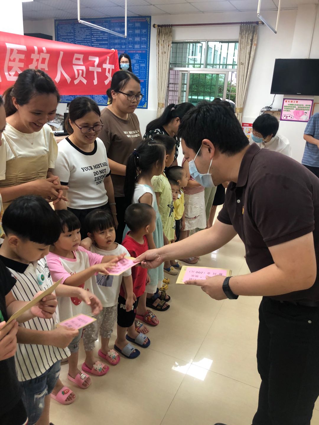 活動(dòng)中,馮志翔代表鎮(zhèn)委鎮(zhèn)政府向堅(jiān)守在抗疫一線的醫(yī)務(wù)代表們表達(dá)敬意和感謝,向小朋友們闡明其父母在疫情期間作出的貢獻(xiàn),理解父母因工作不能時(shí)常陪伴自己,鼓勵(lì)他們努力學(xué)習(xí),健康成長,并為孩子們送上節(jié)日的祝賀。