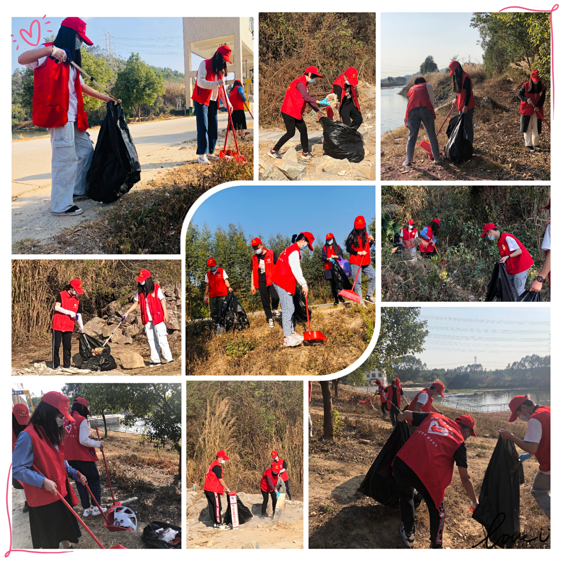 大學生協會志愿服務隊的志愿者們拿著長鉗、掃把、垃圾袋等工具沿著河岸清理岸邊的煙頭、紙屑、塑料袋等垃圾雜物,大家相互配合、分工協作。將收集的煙頭、紙屑、塑料袋等垃圾雜物按垃圾分類要求帶走并投入指定垃圾收集點。