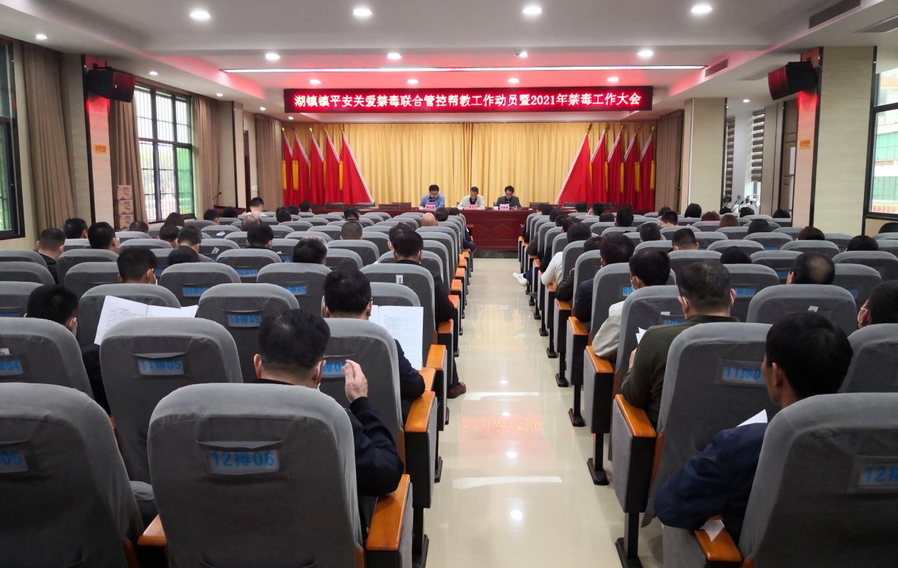2021年3月4日上午,湖鎮鎮在鎮政府公共服務中心二樓會議室召開湖鎮鎮平安關愛禁毒聯合管控幫教工作動員暨2021年禁毒工作大會,鎮委副書記曾學東,鎮委委員高毅敏,鎮禁毒辦全體工作人員、各村(社區)駐村組長、各村(社區)治保主任、婦聯主席以及派出所分管禁毒工作副所長、中小學校分管德育的副校長等成員單位負責人共120人參加了會議,會議由鎮委委員高毅敏主持。