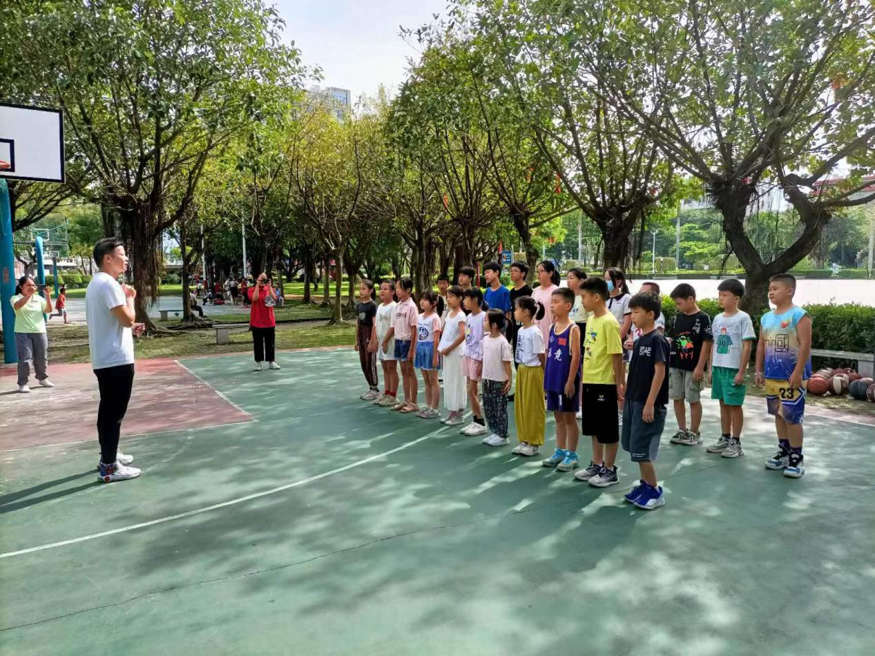 籃球的跳躍遇上夏日的舞動,會給學生們帶來不一樣的夏日熱情。公益班講師宋才華擔任籃球課程老師,在課程開始前,他帶領學生們認真地做好準備運動,耐心仔細地給同學們講解打籃球的注意事項,叮囑學生們要避免籃球運動造成的傷害。