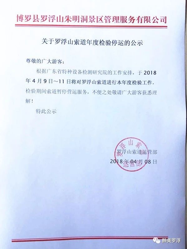根據廣東省特種設備檢測研究院的工作安排,于2018年4月9日~11日將對羅浮山索道進行本年度檢驗工作,檢驗期間索道暫停營運服務,不便之處敬請廣大游客獲悉理解!